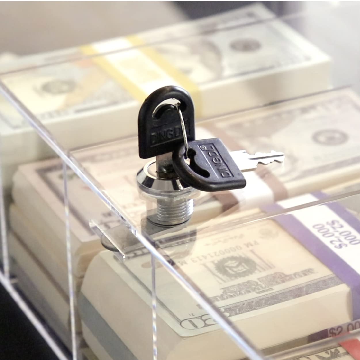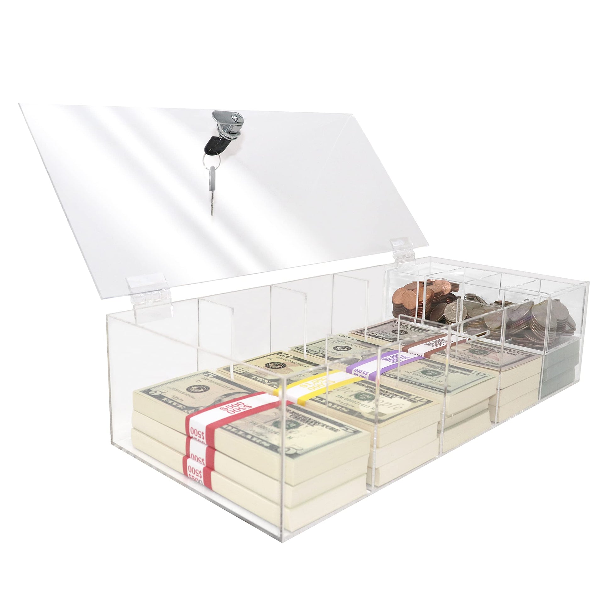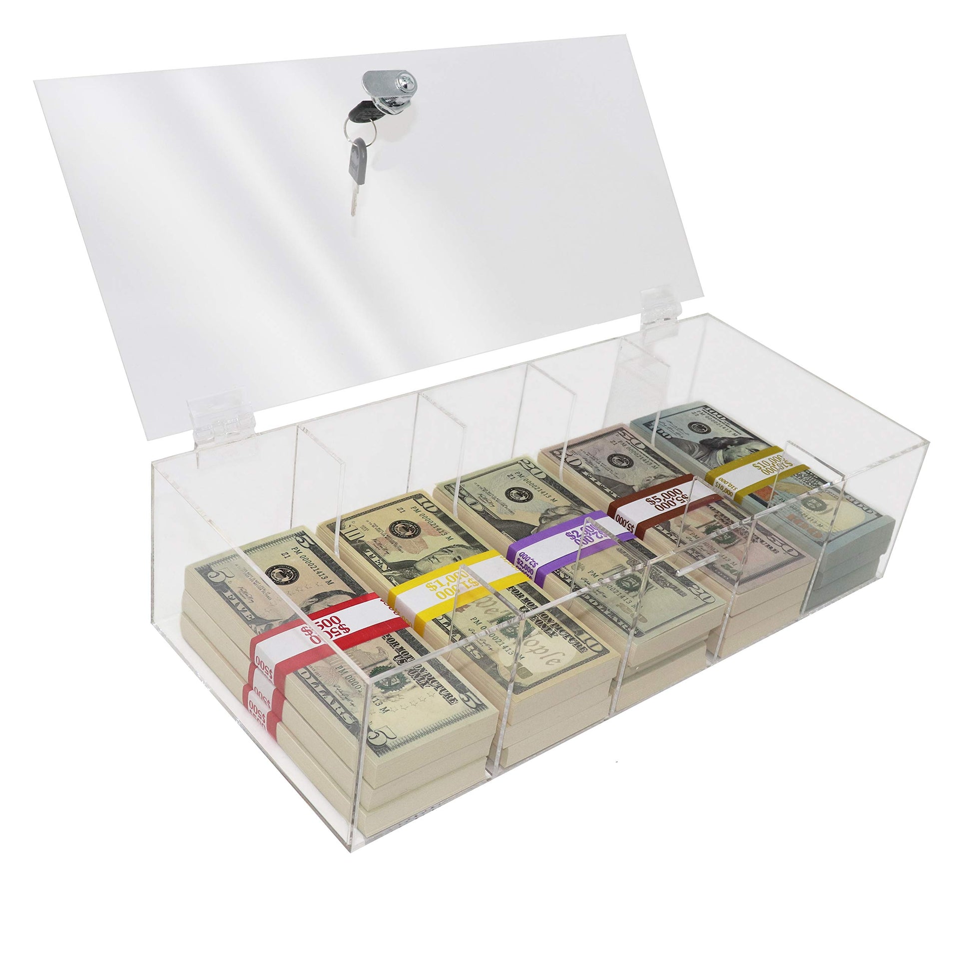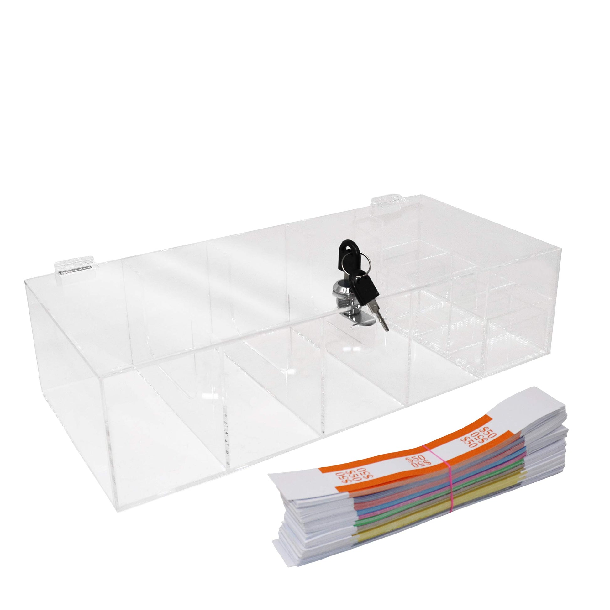 5 Compartment Acrylic Currency Tray with Locking Cover. The money tray has 300 currency wrappers included!. Ideal Design for a safe, desk drawer, or lock box. Cross Reference: 225107204. Currency tray dimensions: 15-3/8" x 7" x 4"..