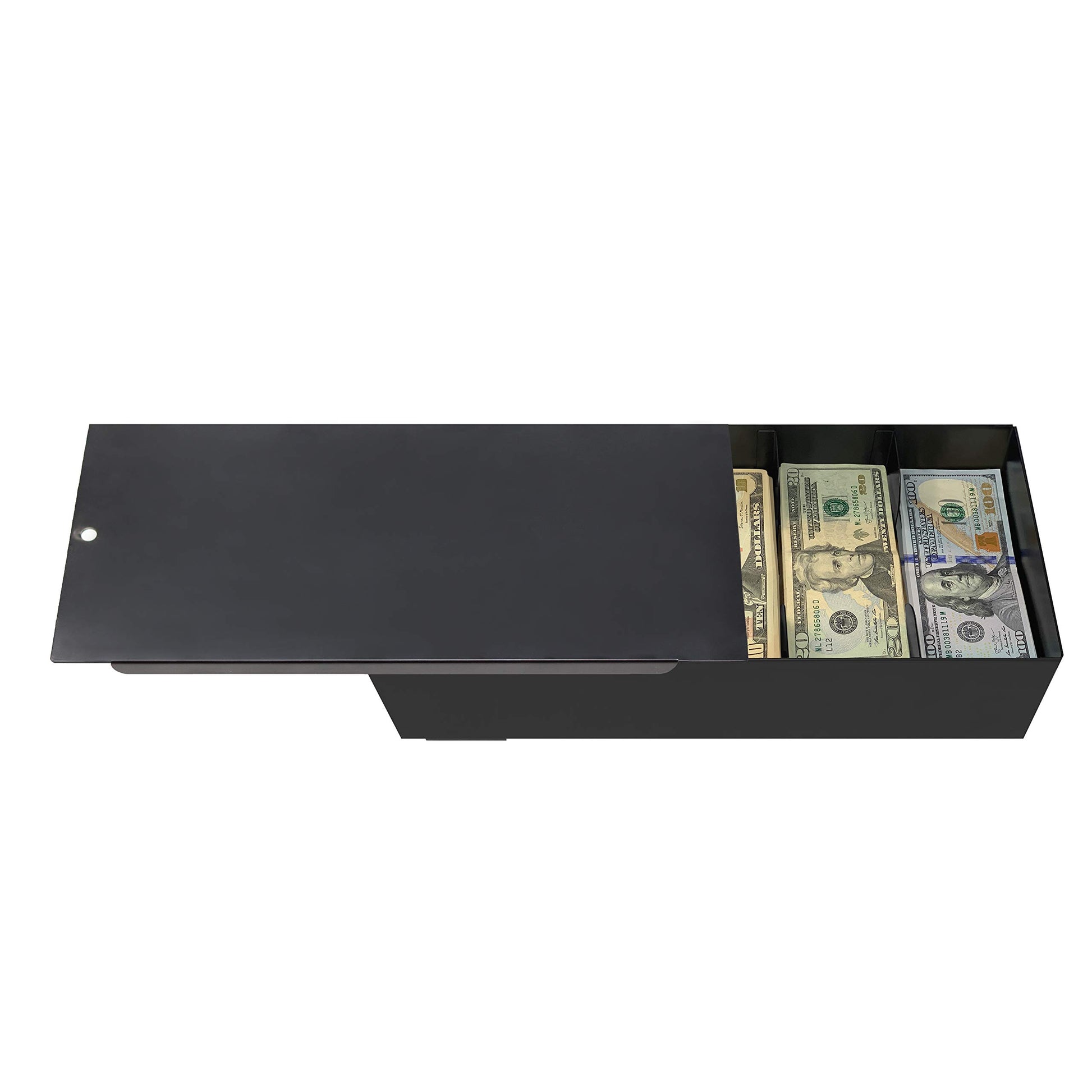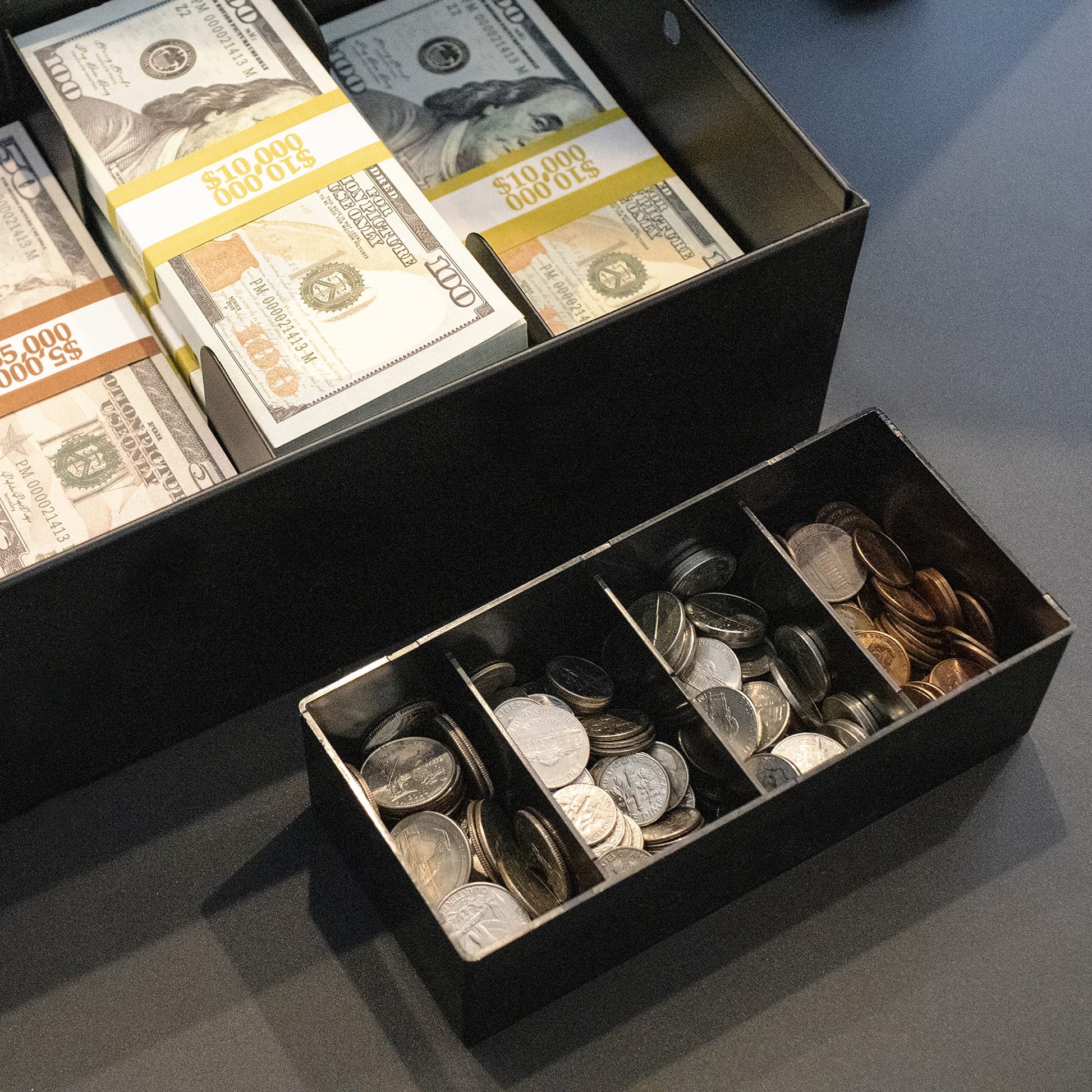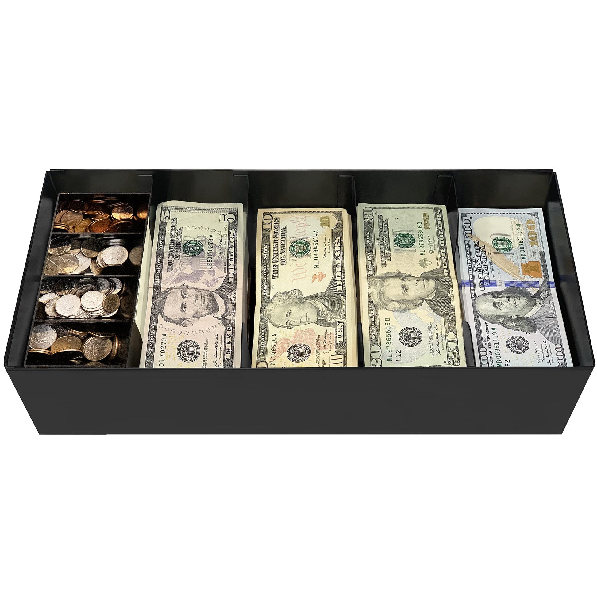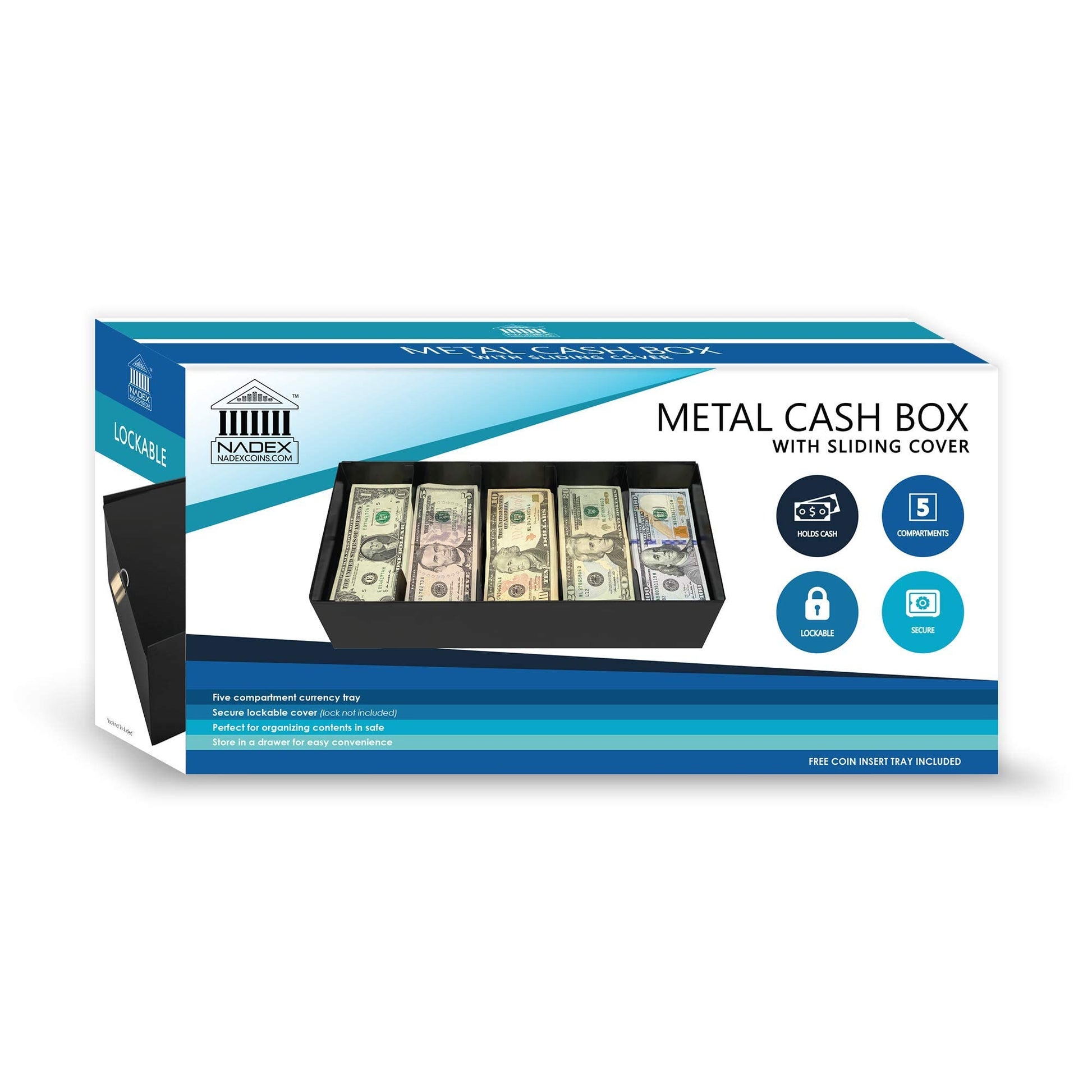 Our Metal cash box with sliding cover and 5 compartments keeps your cash organized, safe from damage and is easy to carry around and store.. Features: 5 Currency slots bills and a removable Coin insert for loose change. Cover for extra safety to prevent cash from sliding out or getting wet. Metal exterior for fire and water safety.. Dimensions: 7.2 x 15 x 3.8 Inches - Perfect for storage in a drawer or cabinet. Cross Reference: 225107204. Ideal for a safe or a lock box. Great for festivals, pop up shops, carnivals, or for any other occasion where you need a portable cash storage solution.. Our Guarantee: Nadex manufactures a variety of coin management and money storage products. All Nadex products are backed by a 1 Year warranty! Please visit Nadex Coins to activate and don’t hesitate to contact us with any questions or concerns.