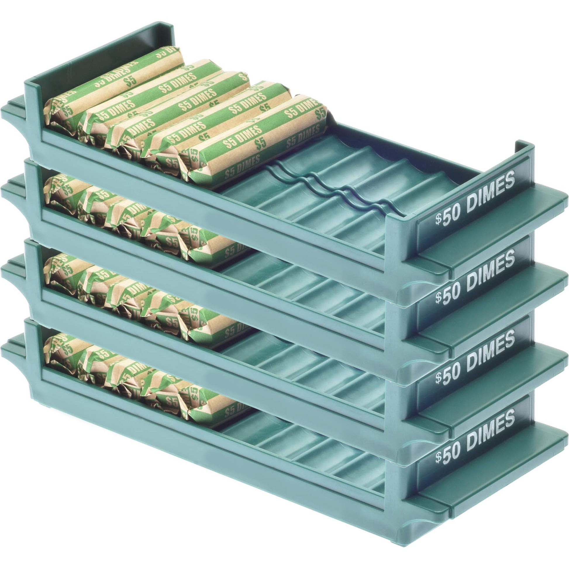 4 Pack of stackable coin roll storage trays, color coded to ABA standards matched to the 40 included coin rolls. Strong molded thermoplastic, ridges for loose coins. Max Size: 9.8 x 3.7 x 0.9 inches.. 40 Coin Wrappers are included to get you started on your coin storage journey!. ABA Standards Color Coding: Blue = Nickels, Green = Dimes, Orange = rters, Re d= Pennies. This makes it easy to match your trays with your coin wrappers, and will match to banking standards. Reliability: Our coin trays are made with strong molded plastic which will last you for many years; and our wrappers are made with high quality paper.. Features: Each denomination tray is stackable over its own type if you purchase multiple sets. Each tray holds 10 coin rolls. Rows also have ridges for holding loose coins.. Our Guarantee: Nadex manufactures a variety of coin management and money storage products. All Nadex products are backed by a 1 Year warranty! Please visit Nadex Coins to activate and don’t hesitate to contact us with any questions or concerns.
