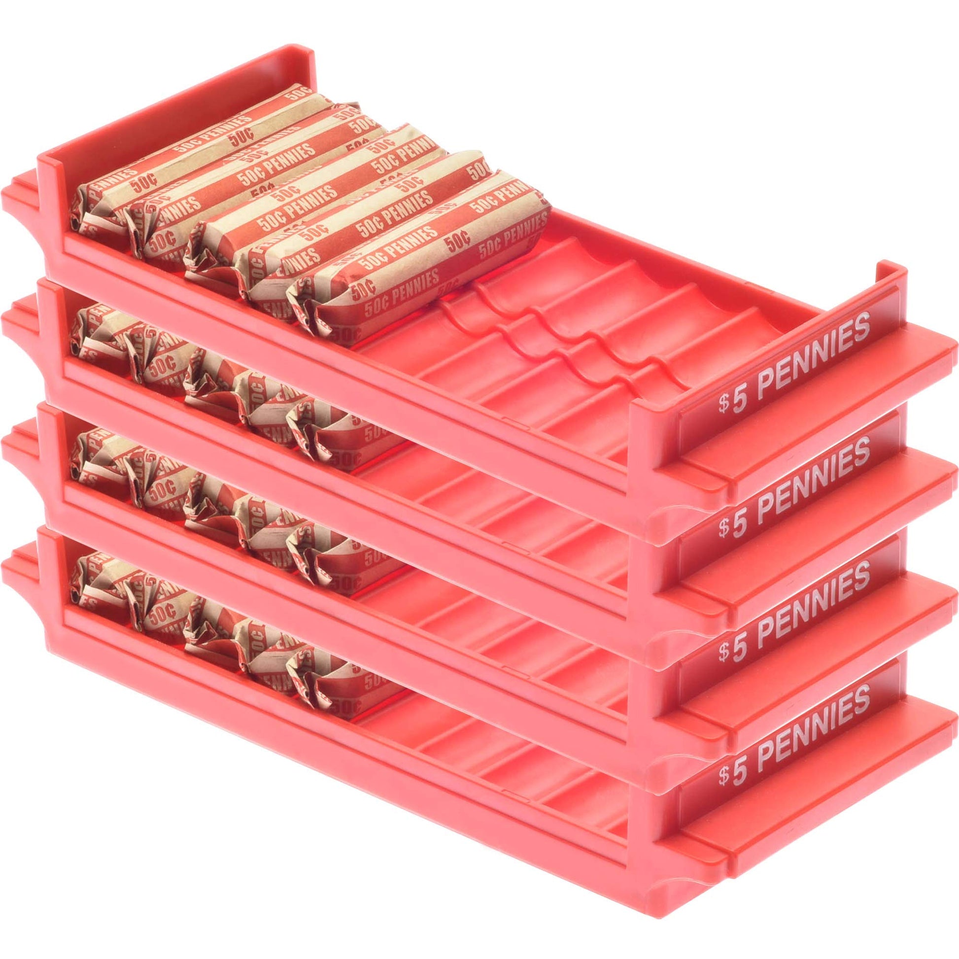 4-Pack Nadex Rolled Coin Storage Organizer Tray Set with Ridges for Loose Coins | Quarters, Dimes, Nickles, and Penny Color Coded Trays. 4 Pack of stackable coin roll storage trays, color coded to ABA standards matched to the 40 included coin rolls. Strong molded thermoplastic, ridges for loose coins. 1 year warranty.