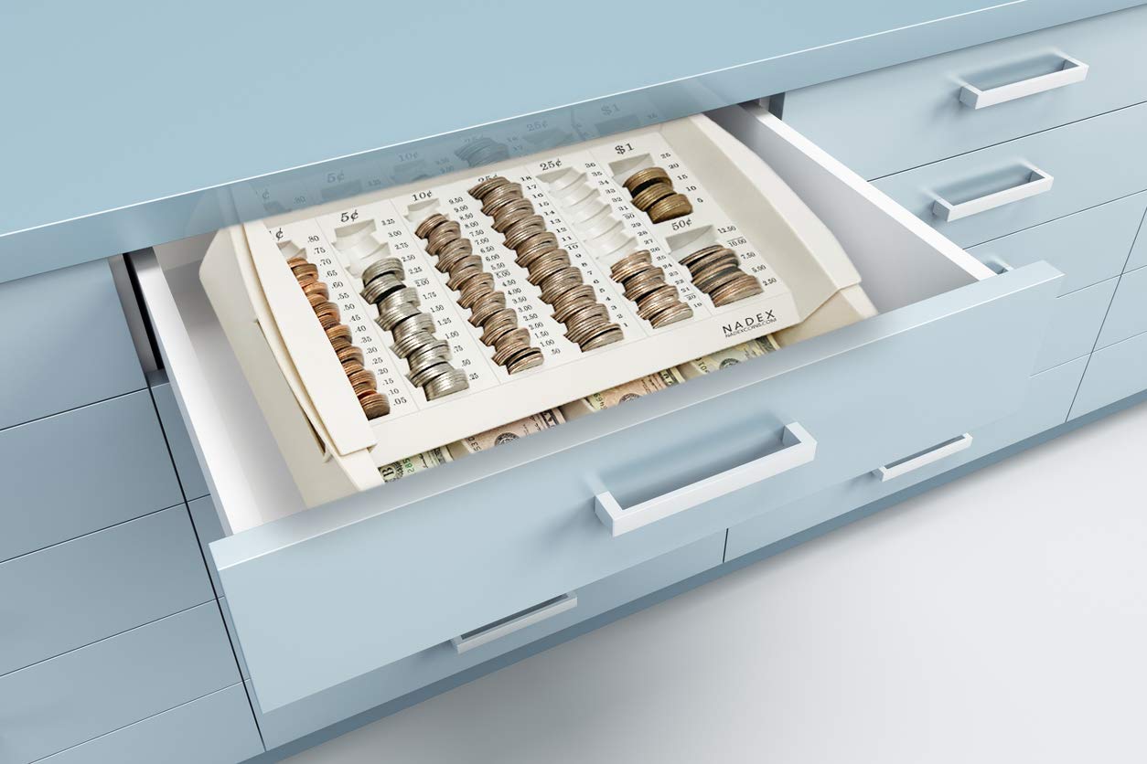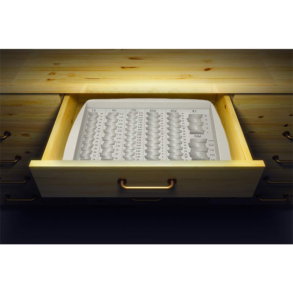 2 Levels (Cash and Coin) - the upper features a self-counting change tray and lower features a 6 compartment cash/storage tray.. Lower cash tray is removable for additional receipt and document storage.. Change tray automatically lifts angled for easy access to coins. Cross reference: 221611003, 221611004. Six precision-molded coin compartments that hold pennies, nickels, dimes, quarters, halves and dollar coins for at-a-glance counting. Denominations and amounts marked.. Includes FREE coin wrappers.