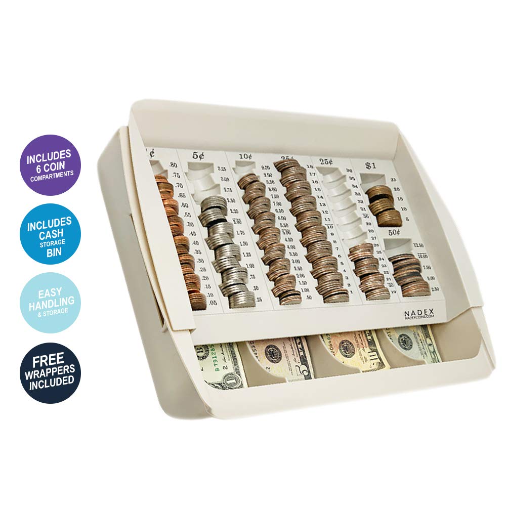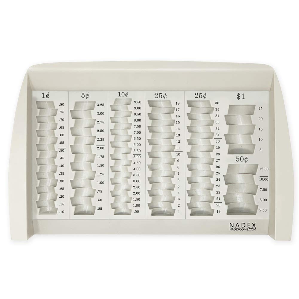 - Six precision-molded coin compartments that hold pennies, nickels, dimes, quarters, halves and dollar coins for at-a-glance counting. Denominations and amounts marked.