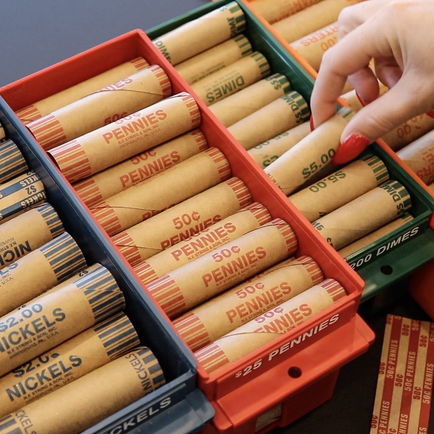 - Lockable quarter, dime, nickel, and penny rolled coin storage tray