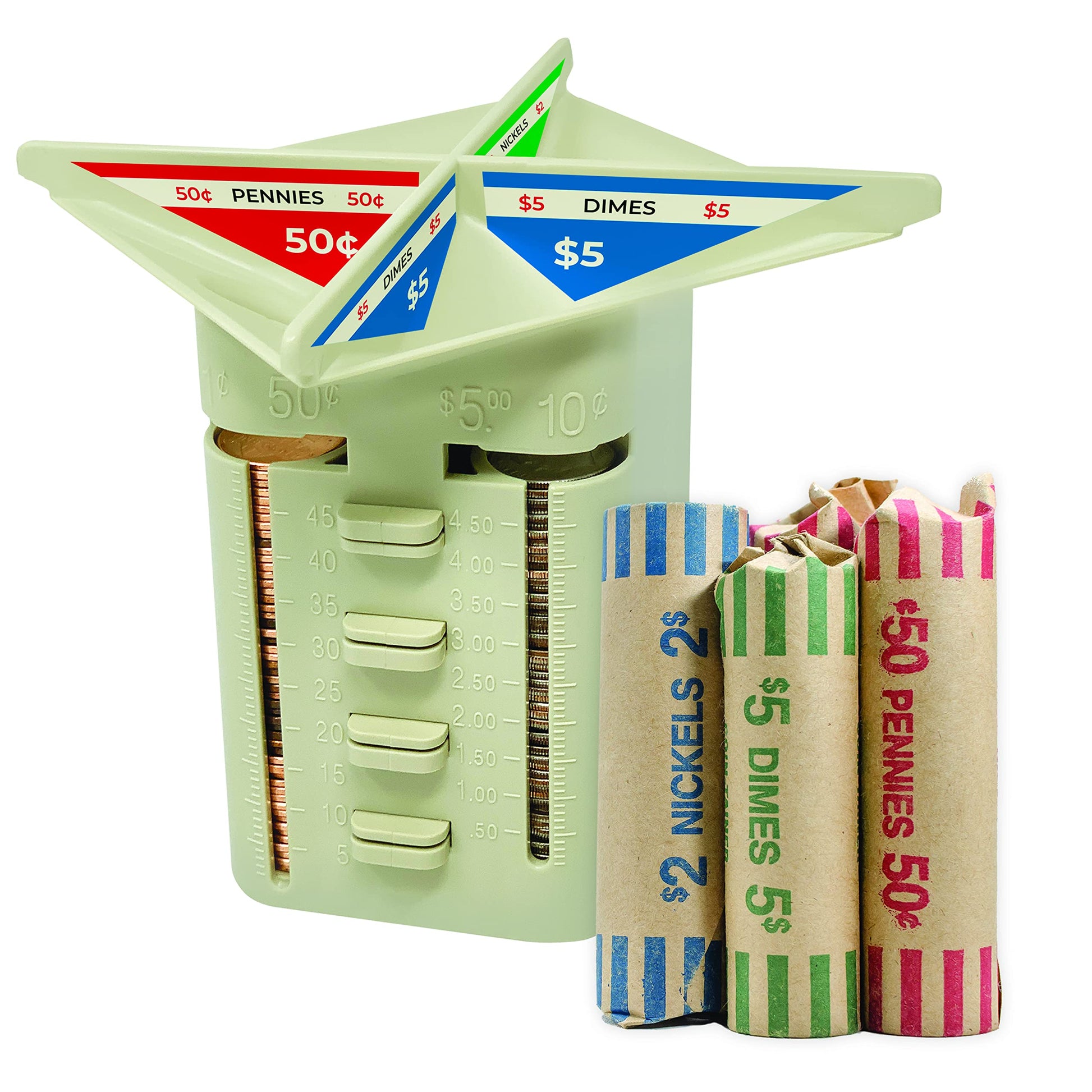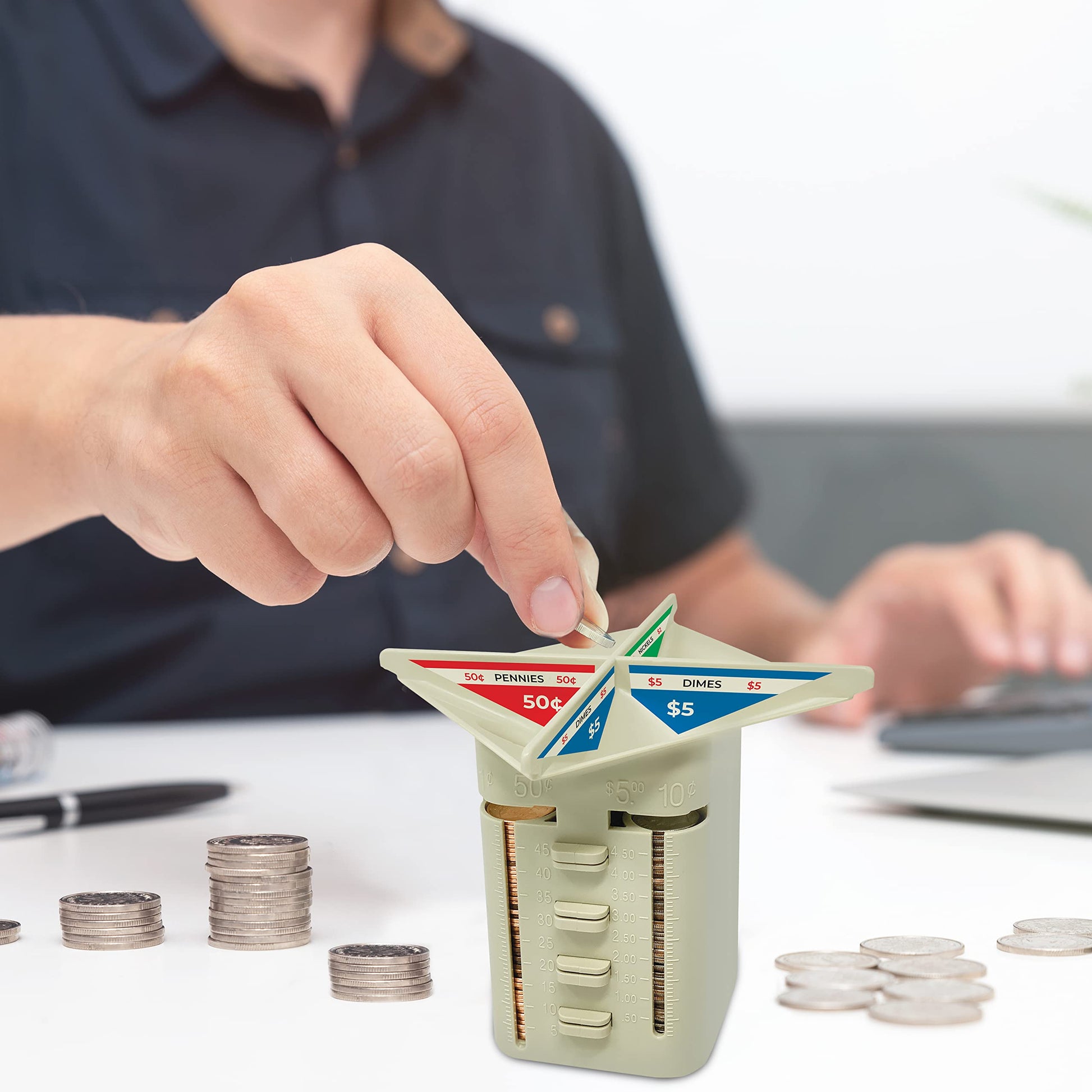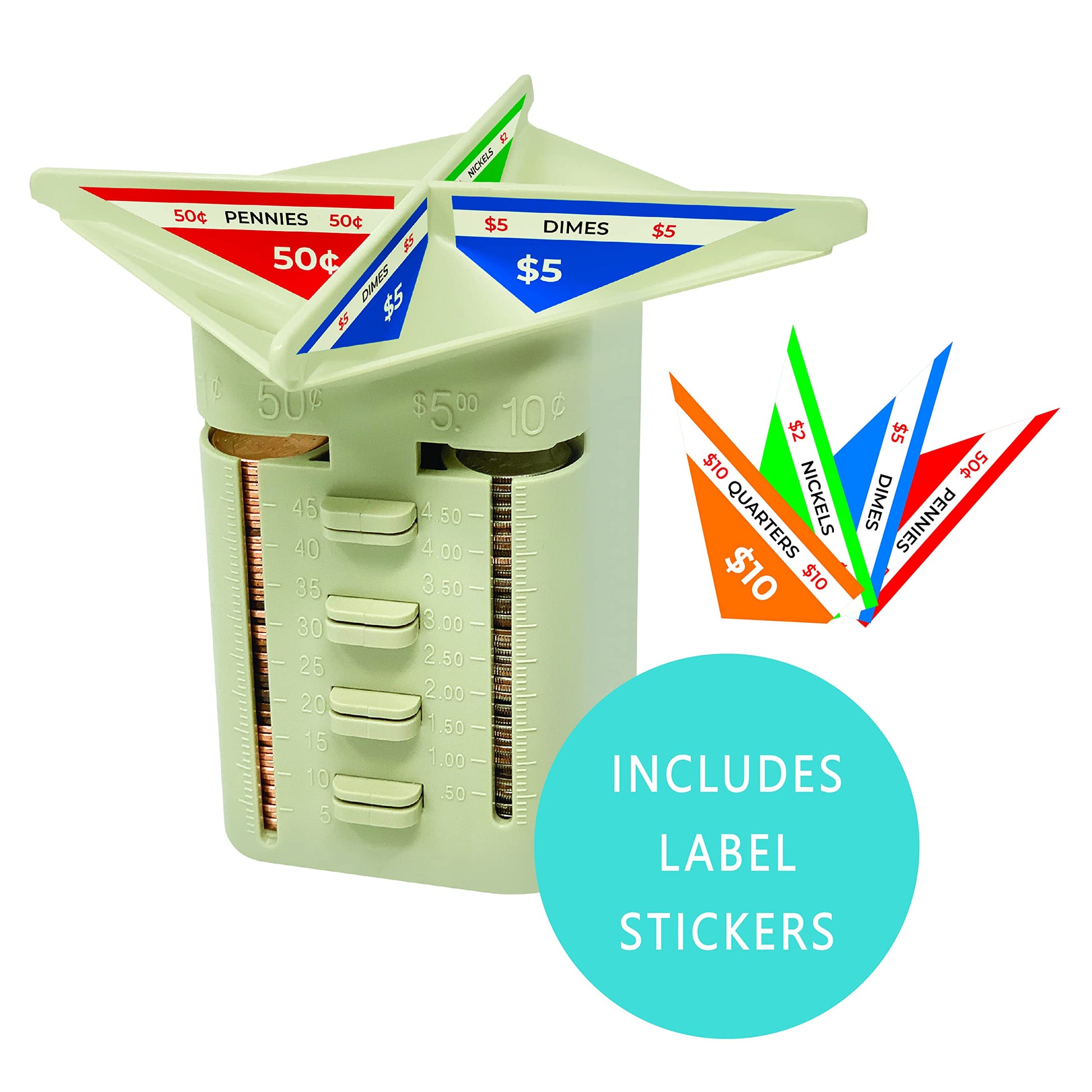 4 Compartment Manual Coin Sorting and Wrapping Organizer. Coin Sorter Tube with Label Stickers for Coin Denomination and 32 Wrappers. Durable high quality material stores Pennies, Nickels, Dimes and Quarters. Vertical counter slots show amount of coins at a glance.