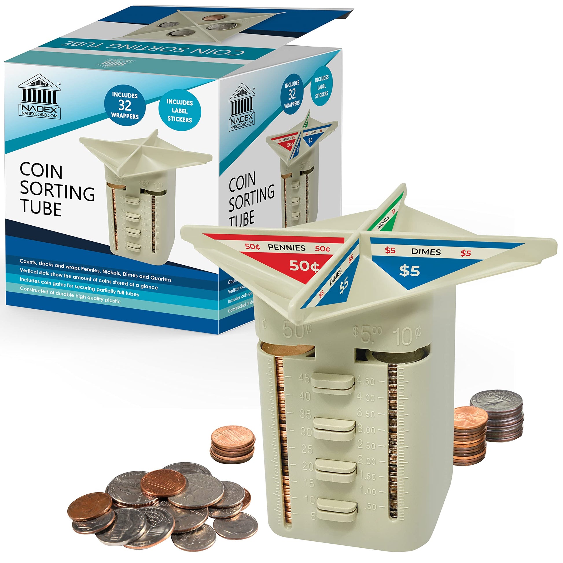 Tired of having 4 separate coin tubes? The Nadex All-In-One Coin sorter eliminates the hassle! Store, sort, count, and wrap your coins all with one device!. Features: Dedicated slots for pennies, nickels, dimes and quarters. Vertical slots with numbered indicators show the amount of coins stored at a glance. Constructed of durable high quality plastic. Use the included coin gates to block partially filled tubes when you turn the tube upside down to fill your coin wrapper. Note: Due to decreasing thickness of older coins, slots may occasionally overcount by one or two coins.. What you get: 1 sorter, colored labels for the 4 currency slots, and 32 coin wrappers. Cross reference: 224000614. Ideal Uses: Great for cash businesses, pop up stores, home use, or even your car!. Our Guarantee: Nadex manufactures a variety of coin management and money storage products. All Nadex products are backed by a 1 Year warranty! Please visit Nadex Coins to activate and don’t hesitate to contact us with any questions or concerns.