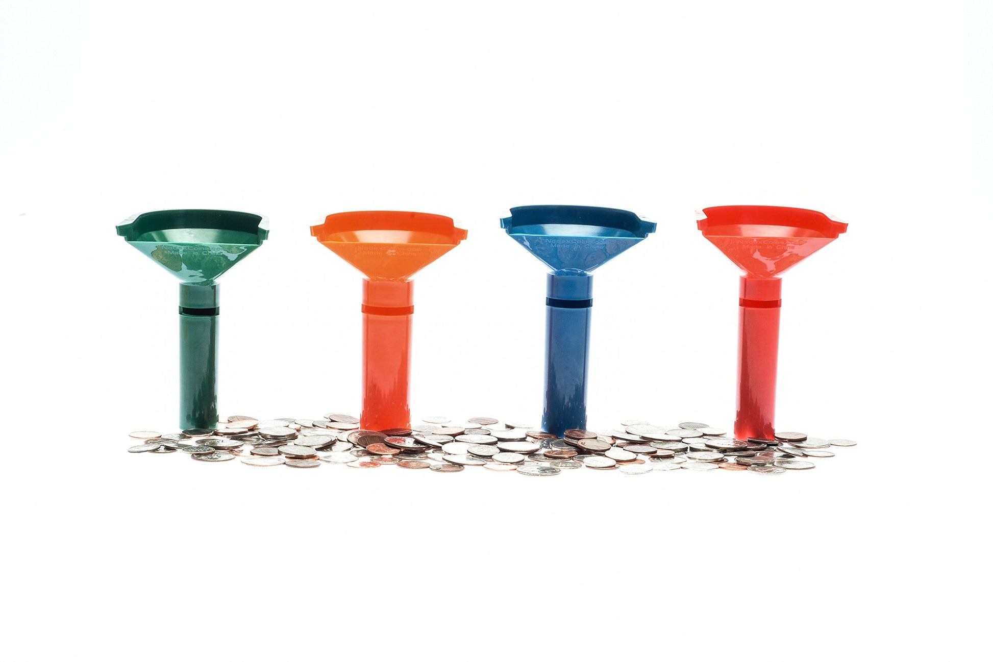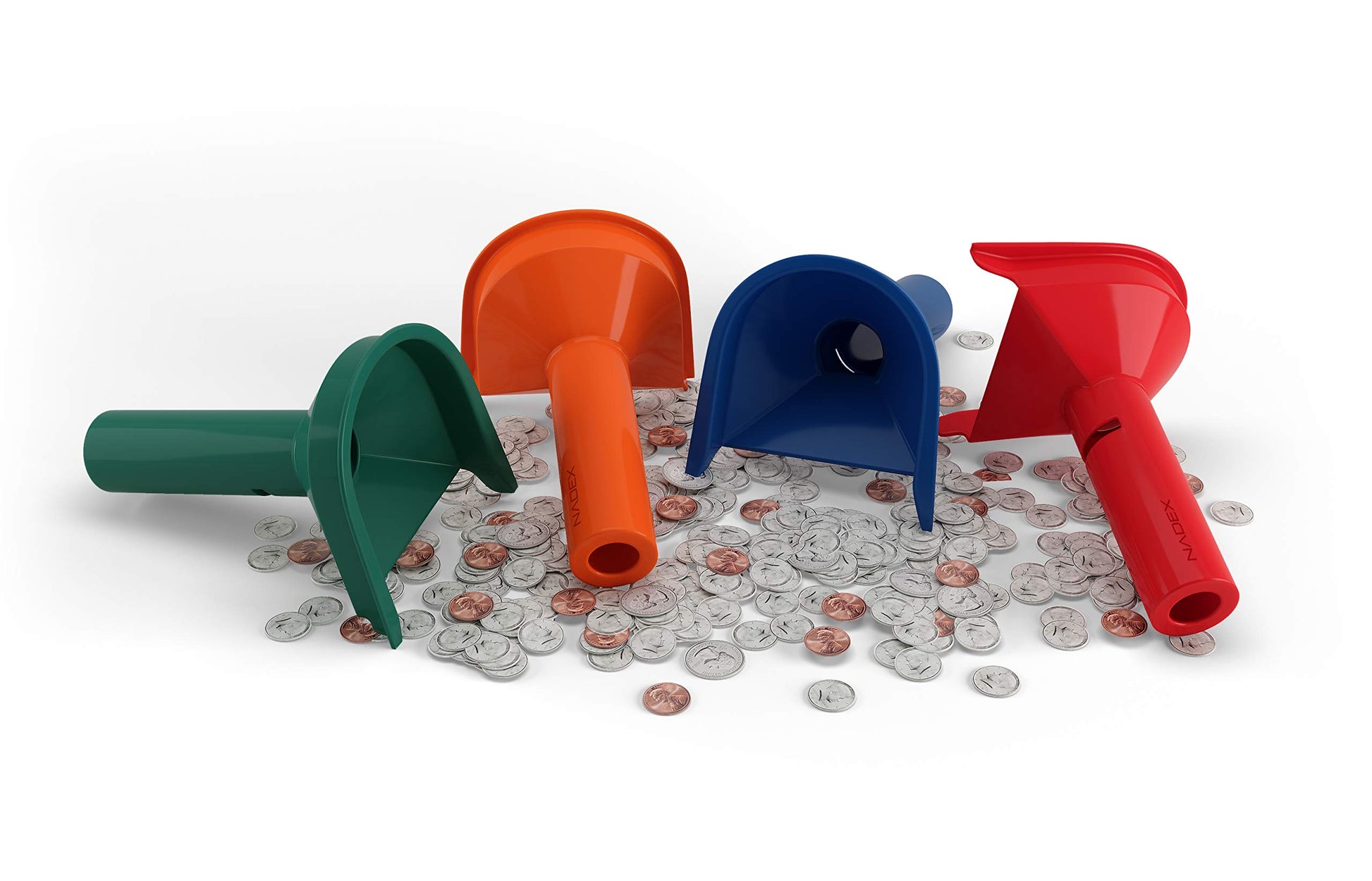 - Four Color-Coded Coin Counting Tubes for Pennies, Nickels, Dimes, and Quarters