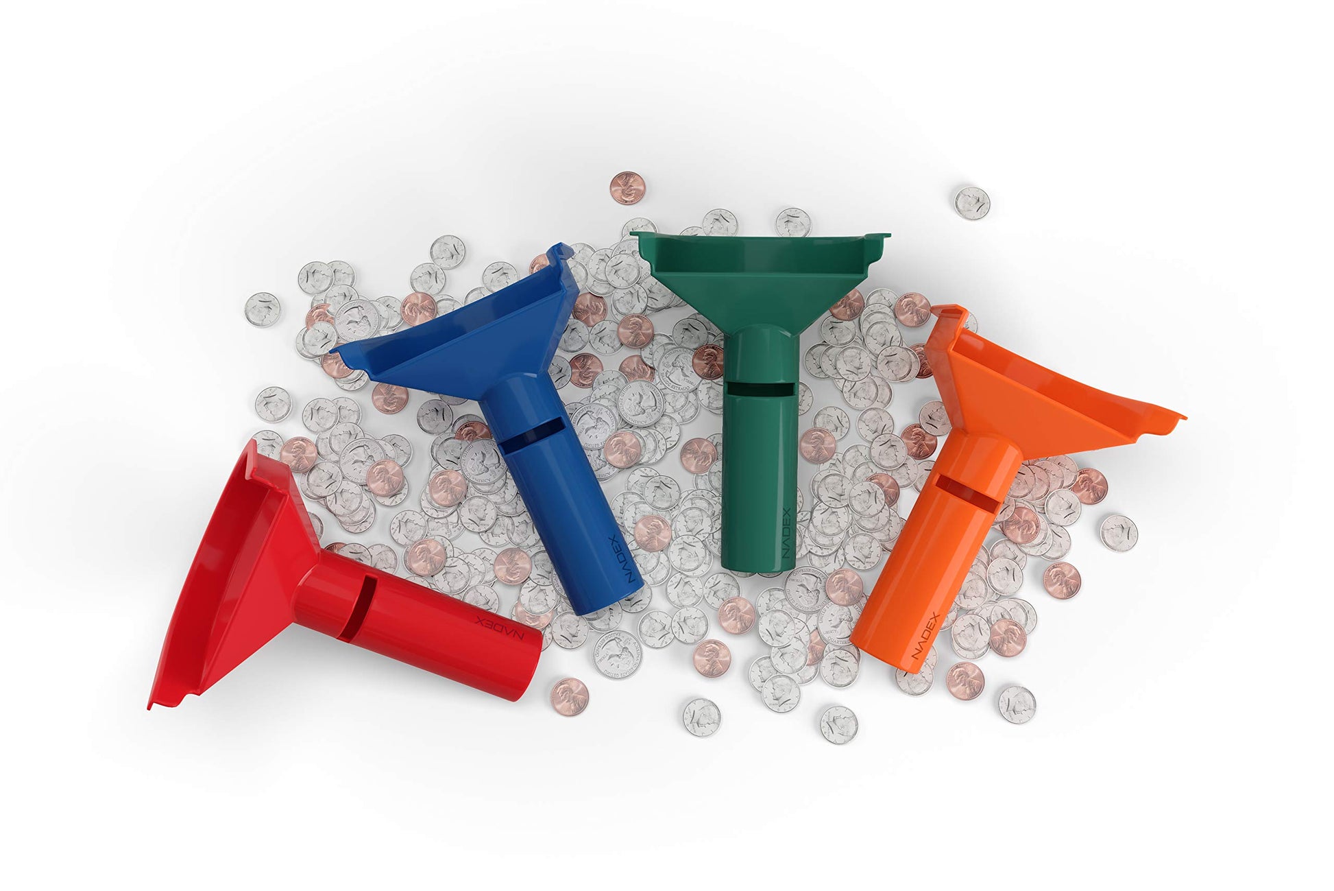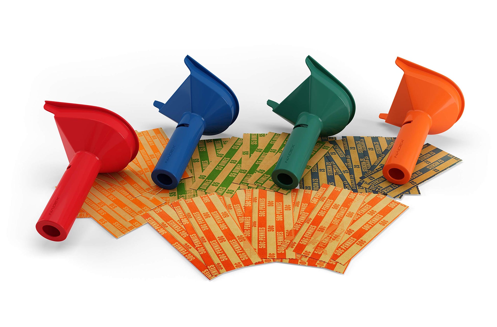 Included Coin Wrappers: Our 4 color coded coin sorting tube set comes with 40 wrappers. 10 of each type; Quarters, Dimes, Nickles, and Pennies.. Quick Fill Instructions: 1) Fill the color coded tubes with your coins and use the slot to determine when your tube is full. 2) Insert the coin wrapper into the top of the tube above the coins. 3) Invert your tube to fill the wrapper. Please note: Due to decreasing thickness of older coins, the amount of coins that fill up the tube is approximate.. ABA Standards Color Coding: Blue= Nickels, Green= Dimes, Orange= Quarters, Red= Pennies. This makes it east to match your tubes with your coin wrappers, and will match to banking standards.. Reliability: Our coin tubes are made with strong molded plastic which will last you for many years; and our wrappers are made with high quality paper.. Our Guarantee: Nadex manufactures a variety of coin management and money storage products. All Nadex products are backed by a 1 Year warranty! Please visit Nadex Coins to activate and don’t hesitate to contact us with any questions or concerns. Compare with similar items