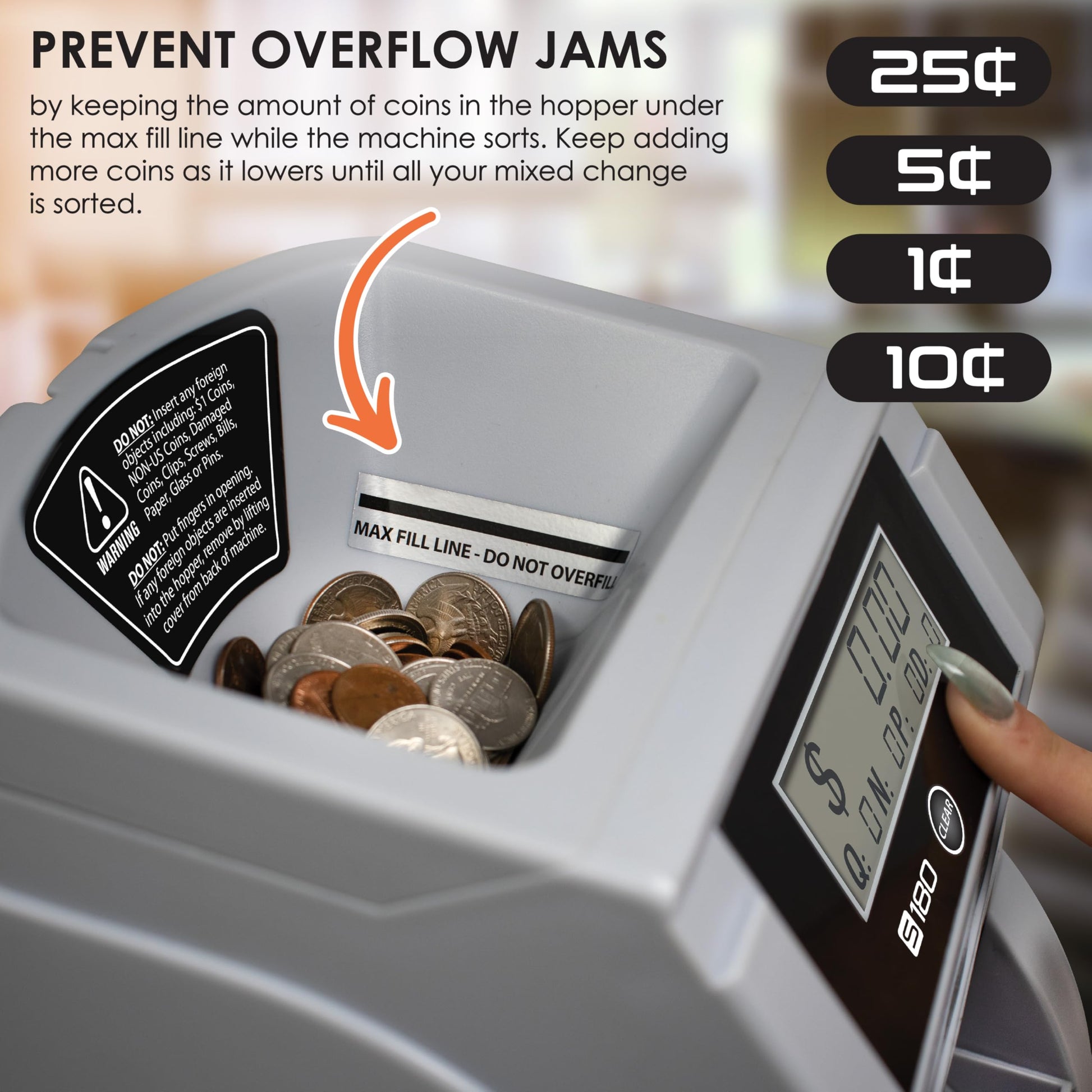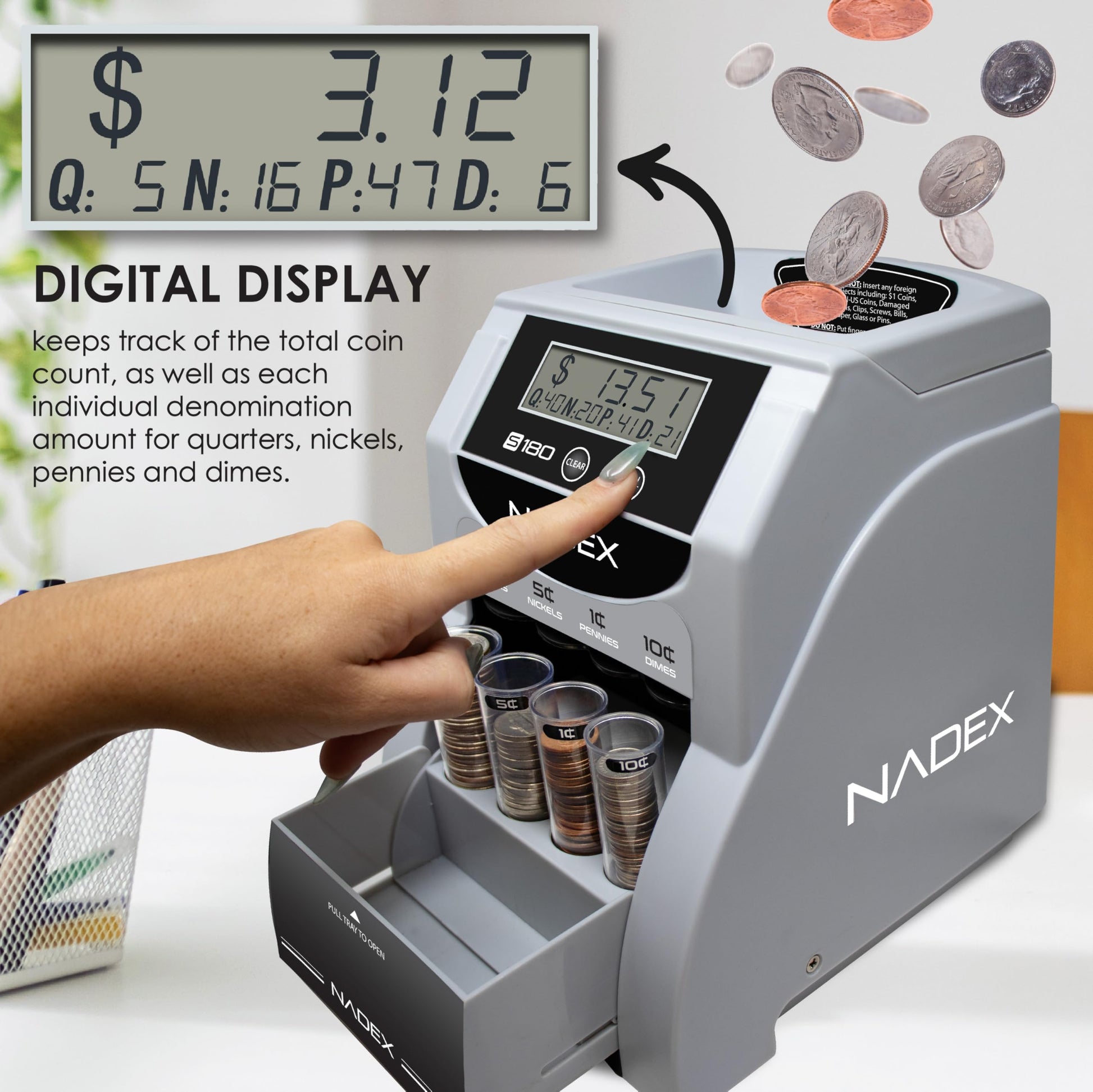 - Display shows value and count of each coin. Automatically stops when coin rolls are full! Digital display shows both the total coin count and the value for each denomination