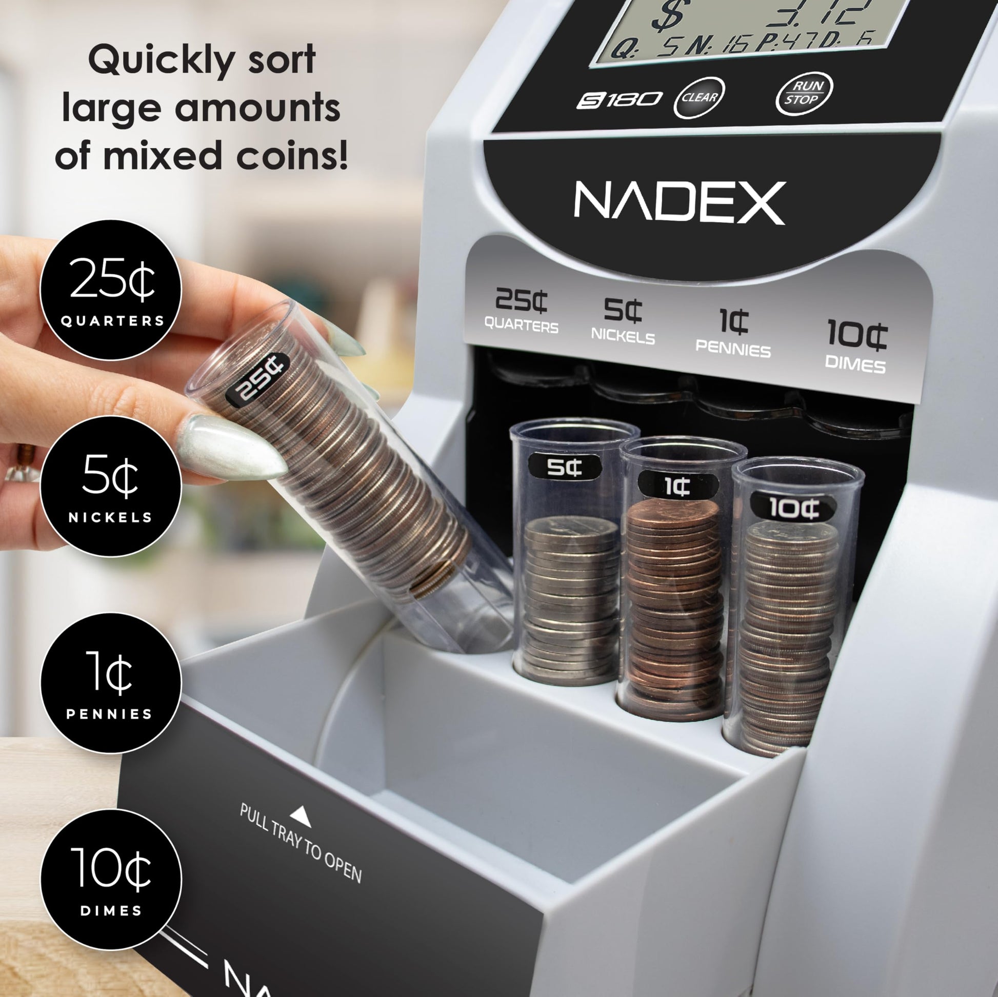 - Efficiently count and sort coins by denomination—pennies, nickels, dimes, and quarters—into dedicated tubes for easy wrapping.