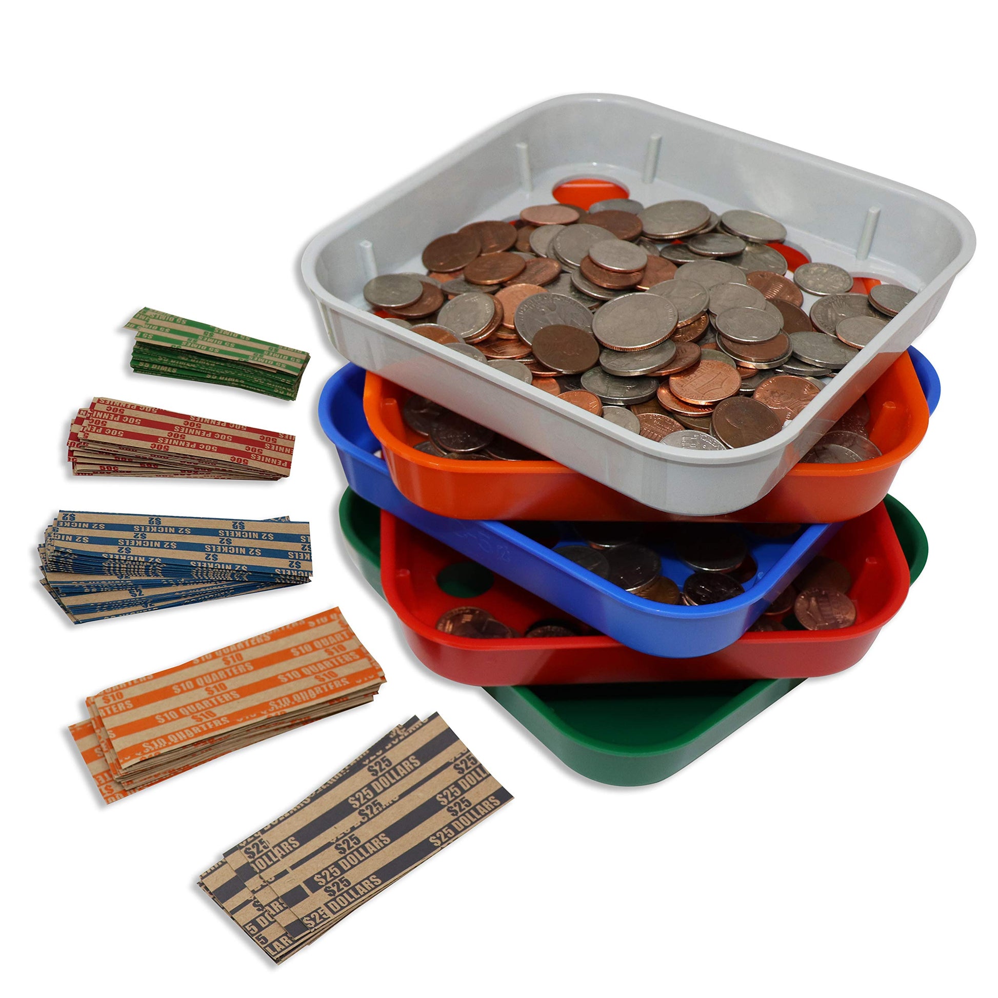 - Included Coin Wrappers: Our 5 color coded coin sorting tube set comes with 110 wrappers - 25 each of Quarters, Dimes, Nickles, and Pennies and 10 dollar coin wrappers