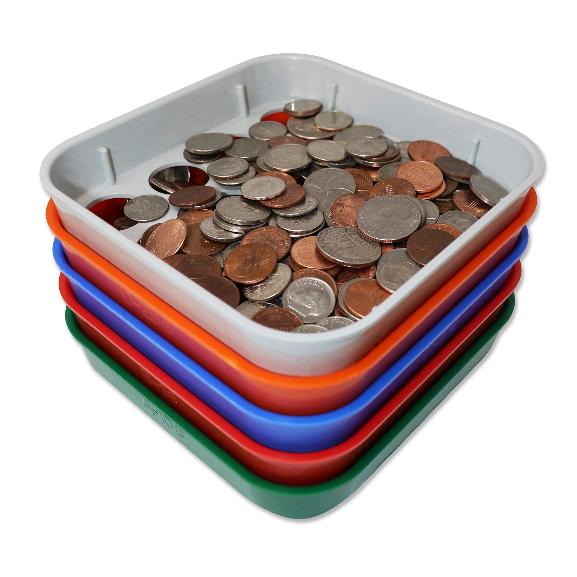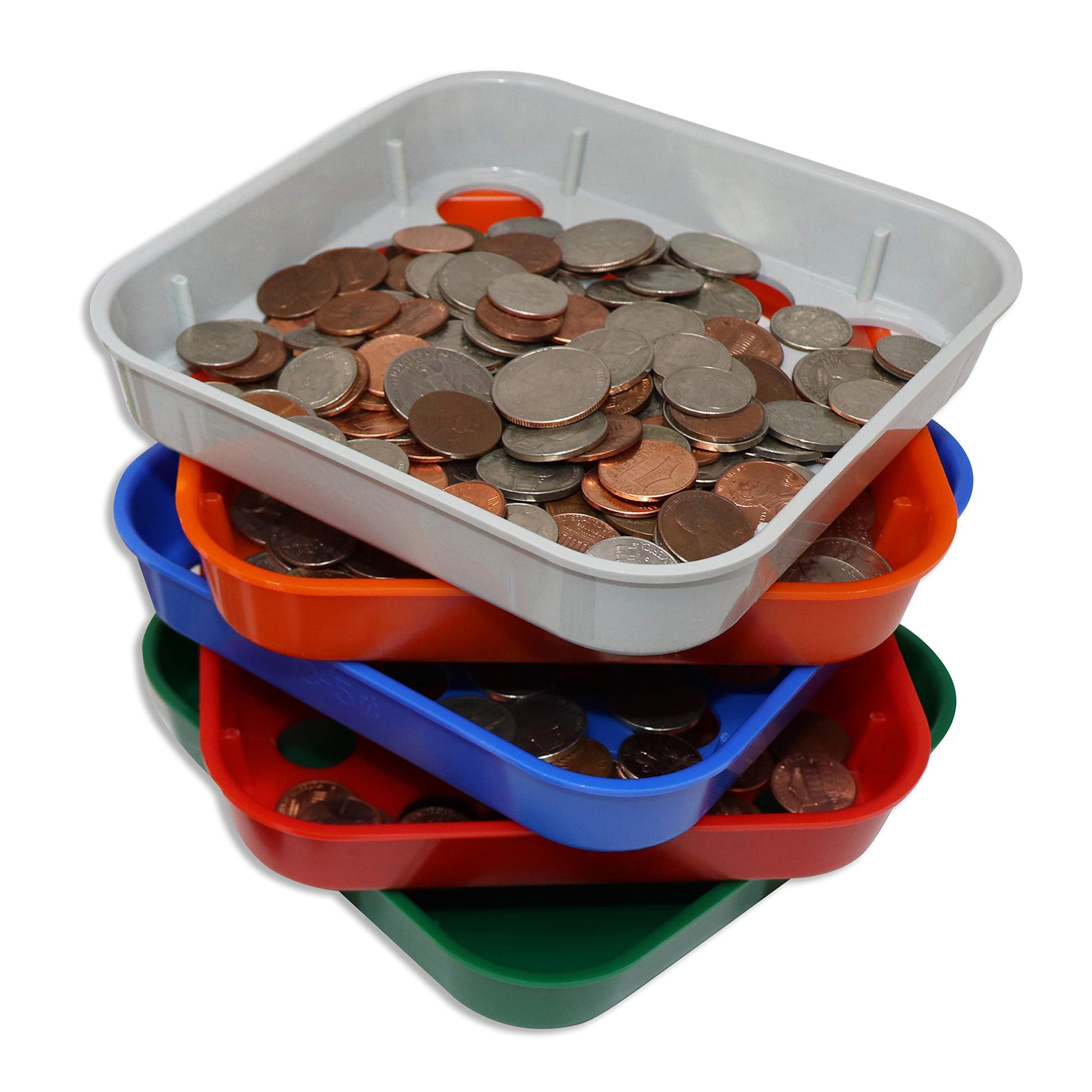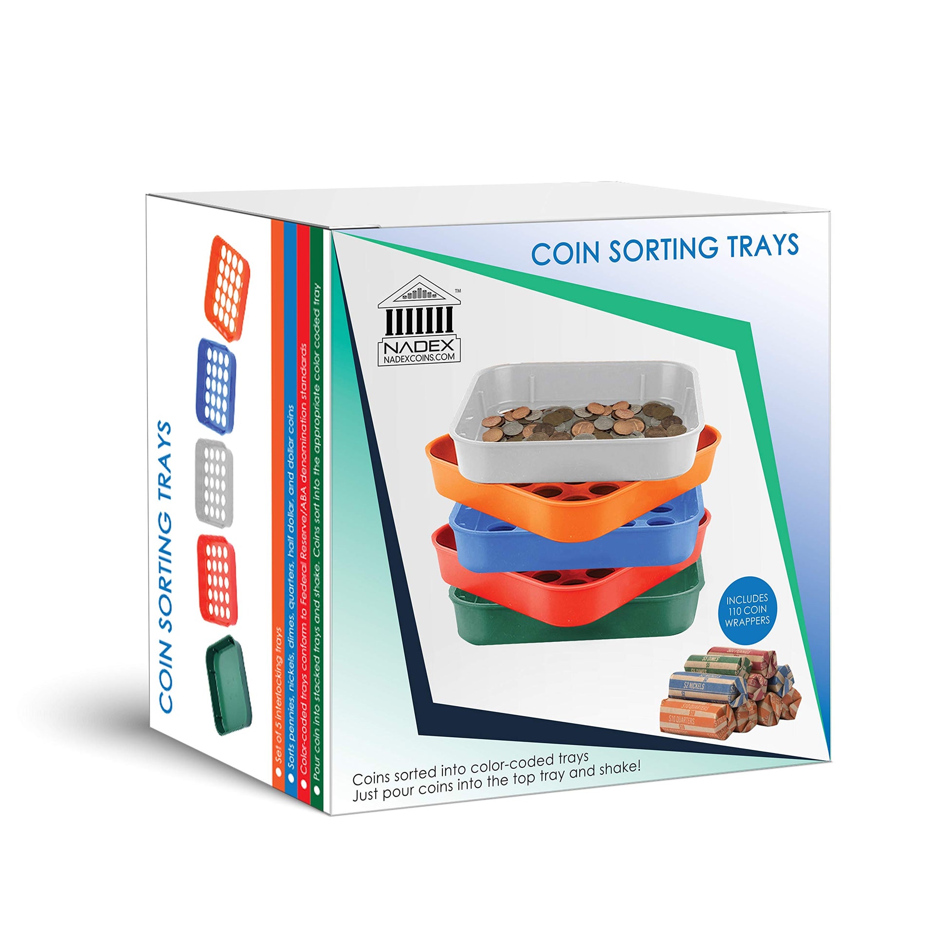 Dollar coin tray included. Ideal for accounting, banking, retail stores, restaurants, educational purposes and more. Dollar coin tube included. Cross reference: 223400000. ABA Standards Color Coding: Blue= Nickels, Green= Dimes, Orange= Quarters, Red= Pennies, Grey = Dollars. This makes it east to match your tubes with your coin wrappers, and will match to banking standards.. Included Coin Wrappers: Our 5 color coded coin sorting tube set comes with 110 wrappers - 25 each of Quarters, Dimes, Nickles, and Pennies and 10 dollar coin wrappers. Wasting time sorting coins? Just pour your coins into the top tray and shake! Simple and time saving!.