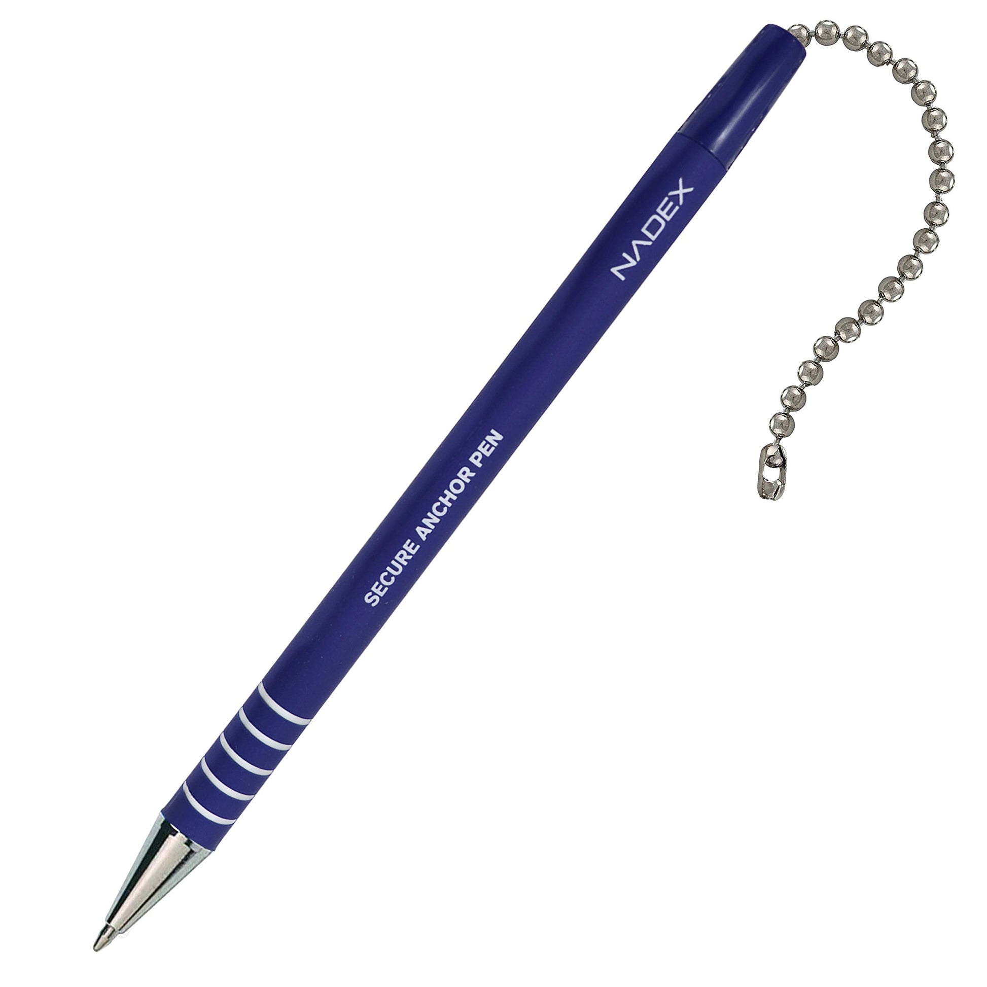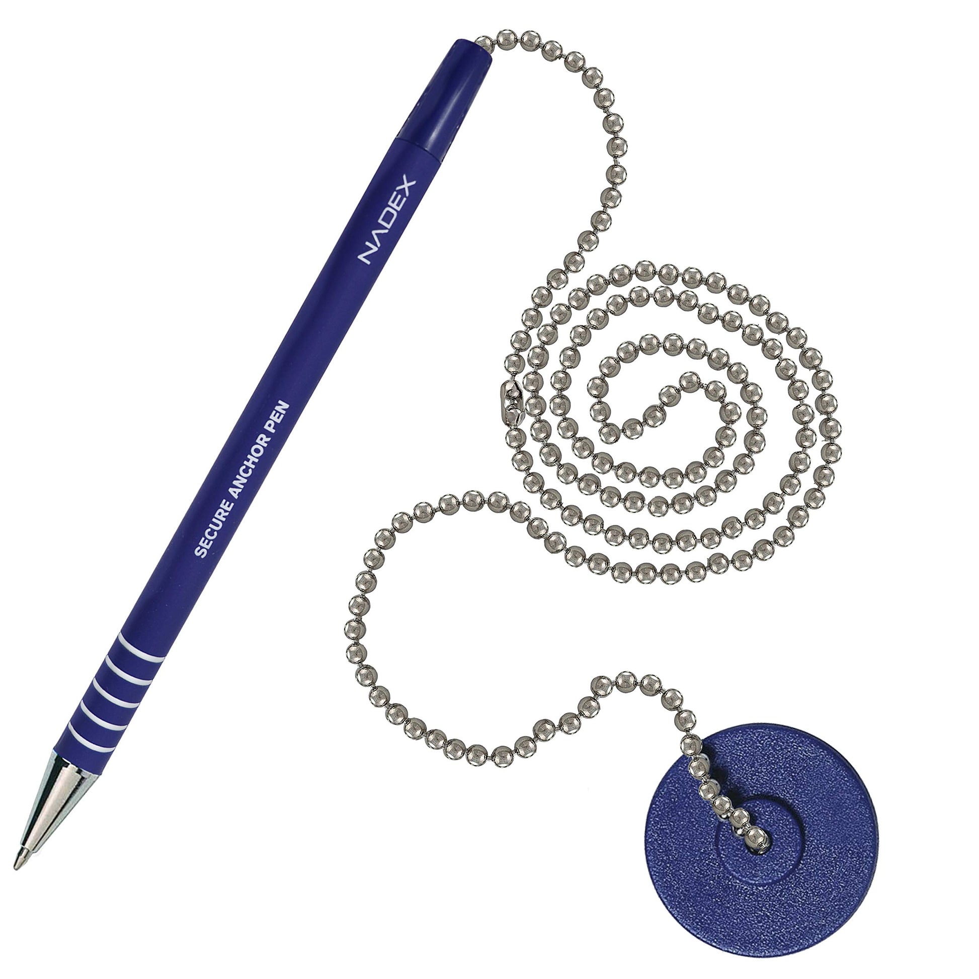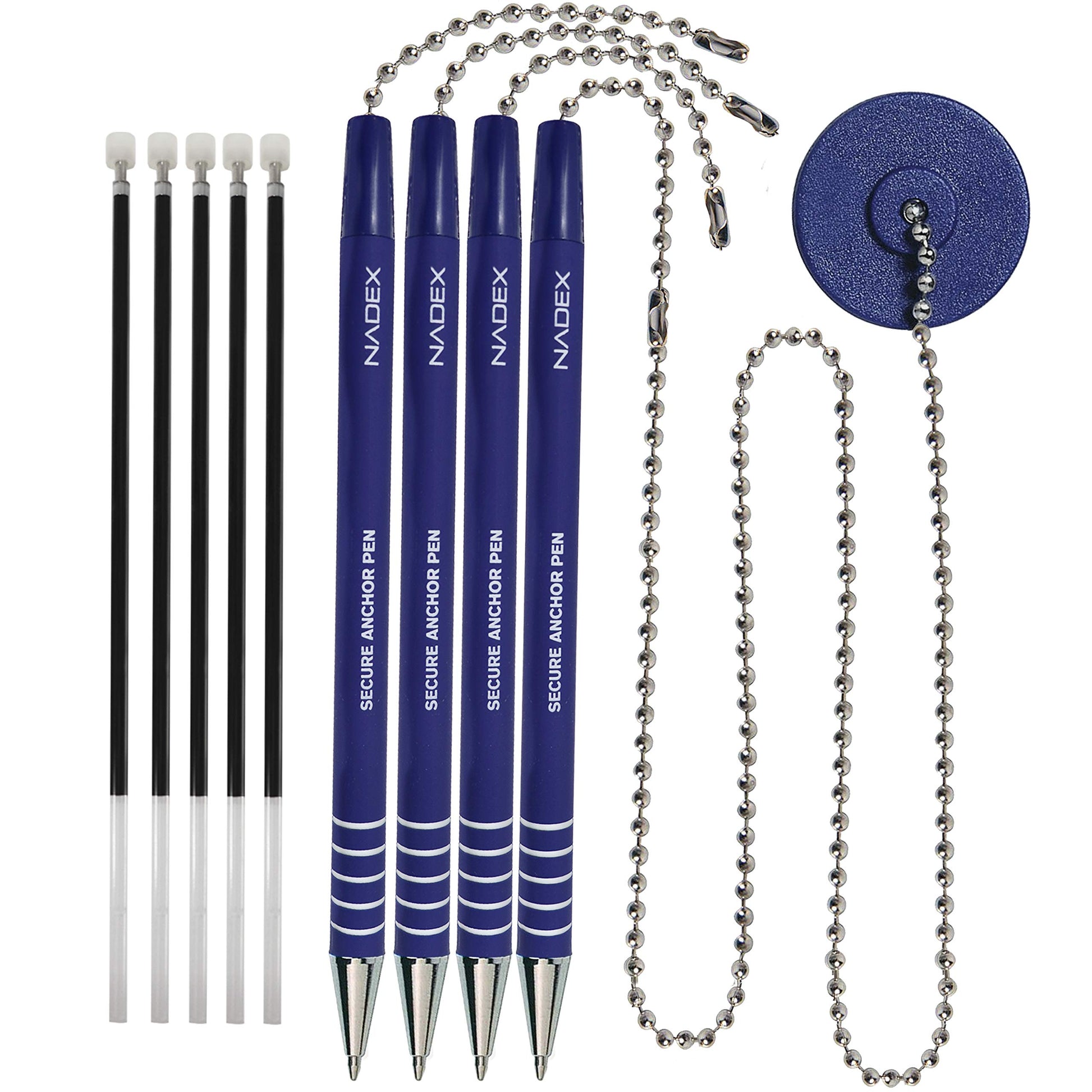 Nadex Ball Chain Security Pen Set. Pack includes 4 Blue Security Pen with ball chain, 1 Base, and 5 refills.. Rubberized grip and ridges for proper feel and writing comfort. Rubber base with peel-able sticky bottom for securing to many types of surfaces.. Security chain for attaching to base. Each pen has a small attached chain with link for quickly attaching and detaching for added convenience. Our pen also works works with many other security pen chains.. Please Note: Do not detatch the bottom plastic part of the pen as it will not be possible to re-attatch. Refills are installed by unscrewing the metal cap at the tip.. Our Guarantee: Nadex manufactures a variety of quality coin management and money storage products. Customer satisfaction is our priority so don’t hesitate to contact us with any questions or concerns. All Nadex products are also backed by a 1 Year warranty and hassle free returns.