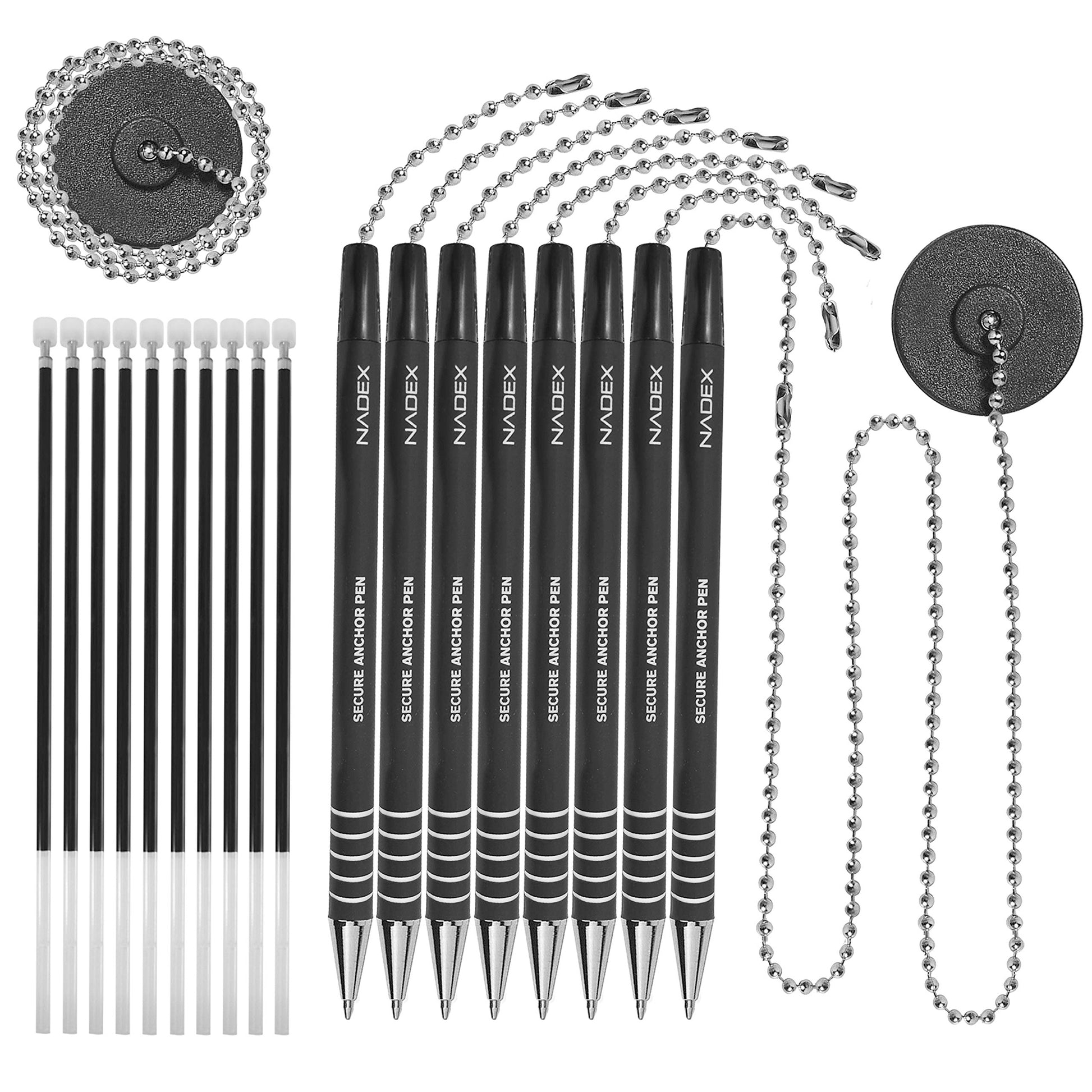 Nadex Ball and Chain Security Pen Set | 8 Pens, 2 Adhesive Mounts, and 10 Refills (Black). Pack includes 8 Black Security Pens with ball and chain, 2 Base Mounts, and 10 refills.