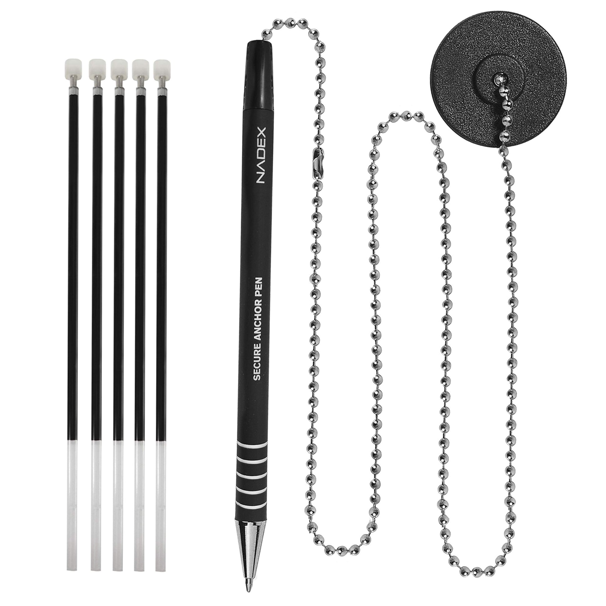 Nadex Ball Chain Security Pen Set. Pack includes 8 Black Security Pens with ball chain, 2 adhesive mounts, and 10 refills.. Rubberized grip and ridges for proper feel and writing comfort. Rubber base with peel-able sticky bottom for securing to many types of surfaces.. Security chain for attaching to base. Each pen has a small attached chain with link for quickly attaching and detaching for added convenience. Our pen also works works with many other security pen chains.. Please Note: Do not detatch the bottom plastic part of the pen as it will not be possible to re-attatch. Refills are installed by unscrewing the metal cap at the tip.. Our Guarantee: Nadex manufactures a variety of quality coin management and money storage products. Customer satisfaction is our priority so don’t hesitate to contact us with any questions or concerns. All Nadex products are also backed by a 1 Year warranty and hassle free returns.