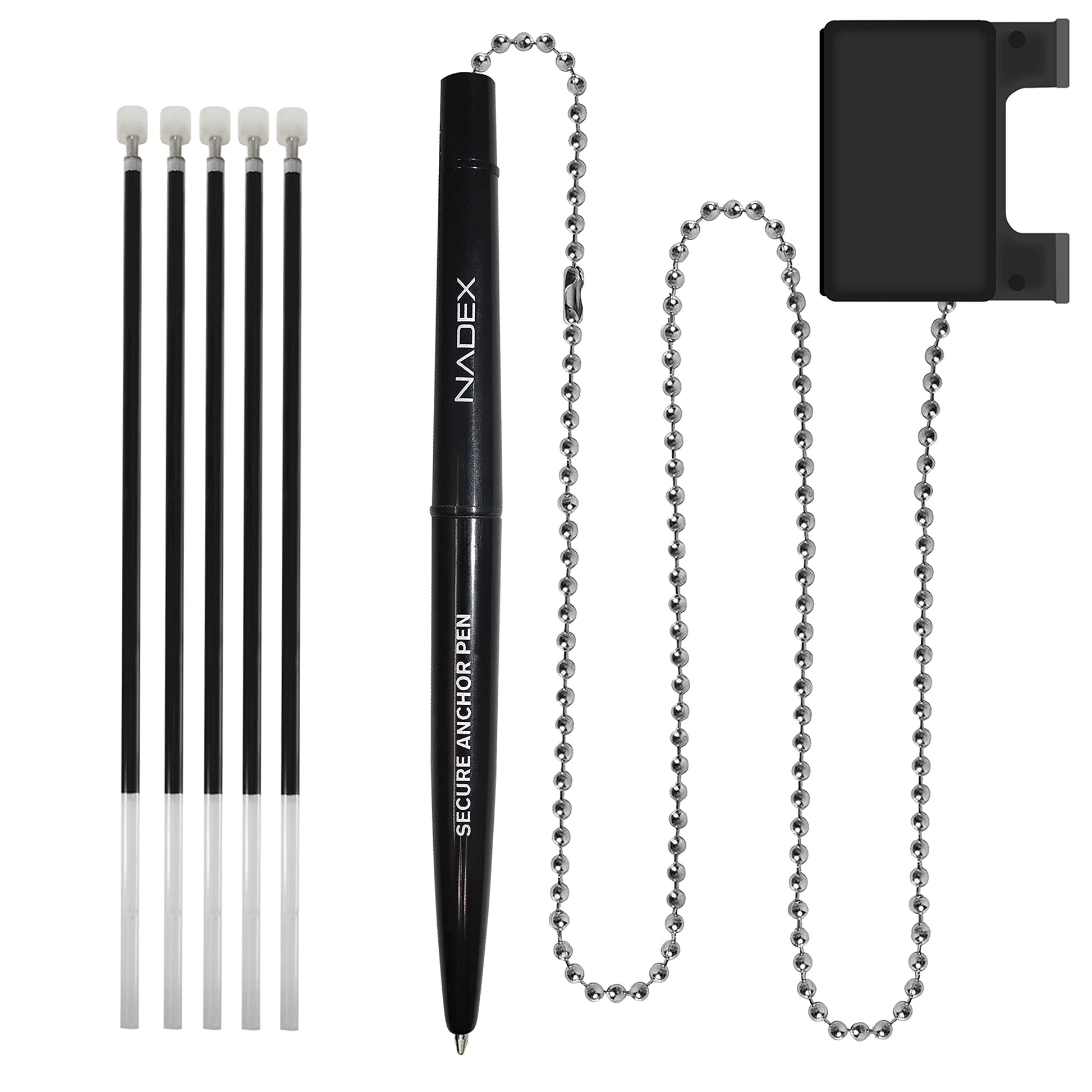 Nadex Ball and Chain Security Pen Set | 1 Pen, 1 Adhesive Mount, and 5 Refills (Black). Pack includes 1 Black Security Pen with ball and chain, 1 Base, and 5 refills.