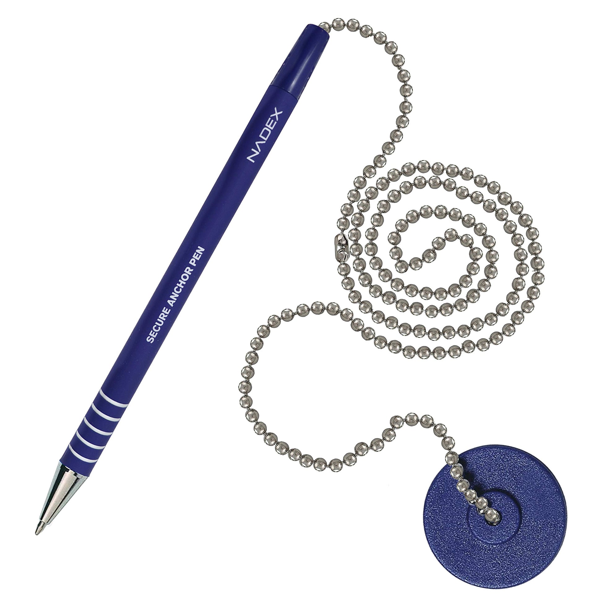 Nadex Ball and Chain Security Pen Set | 12 Pens, 12 Adhesive Mounts, and 12 Refills (Blue). Nadex Ball Chain Security Pens, Blue, 12 Pens. Never lose another pen with this simple yet convenient solution. Comes with extra refills and advhesive anchor mount for easy installation.