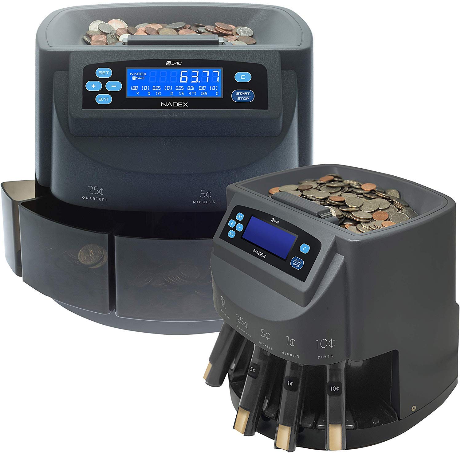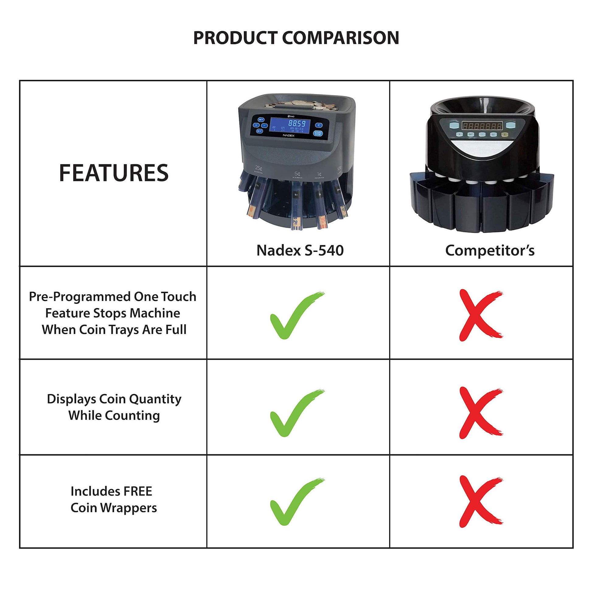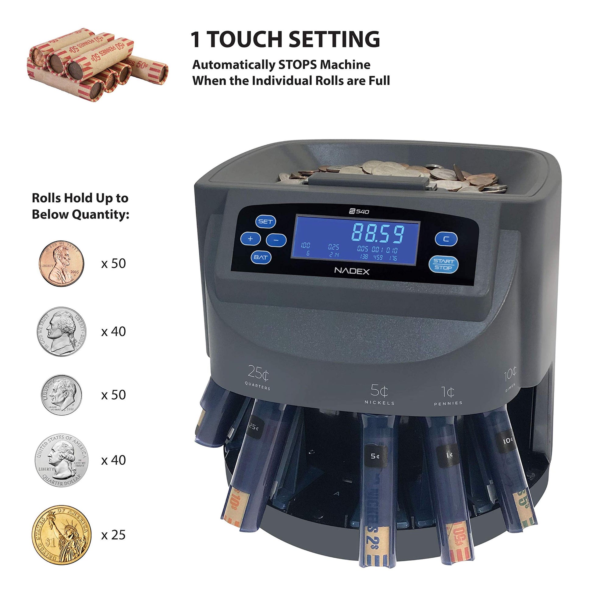 The Nadex S540 is our business grade Nadex S540 Coin Counter, sorter and wrapper. Coin counting and sorting has never been easier! Simply pour your coins into the hopper, press start, and the commercial coin counter machine will automatically count and sort your coins. Easily see the value and count of each coin being sorted by looking at the display. Press the start and stop button at any time to get a final tally.. Key Features: Counts and sorts Dollar coins, Quarters, Nickels, Dimes, and Pennies. Displays both count count and total counted value. Sort into coin trays or directly into coin wrappers with the included coin tube attachments. One touch batch setting with Auto-stop to prevent overfilling. Custom batch settings to sort into trays and into tubes simultaneously for different denominations. 48 preformed coin wrappers included.. In Depth Count Detail: The total value of the counted coins along with the quantity of each coin type displays on the screen during counting. Hopper capacity is up to 2000 coins (dimes). Bin Capacity is Dimes: 900, Nickels: 450, Quarters: 350, Pennies: 300, Dollars: 130.. Multi Use: Coin tube attachments included to automatically and easily fill preformed coin wrappers. Simply place the coin wrappers into the tubes, set the one-touch tube batch setting, press start, and watch them fill up. The coin wrapper machine will automatically stop when a roll is full. Or you can use our Custom batch settings so you can use both the coin trays and tubes at the same time, making coin rolls for some denominations while other coins fill up the bins with the coin roll counter.. Our Guarantee: Nadex manufactures a variety of coin management and money storage products. All Nadex products are backed by a 1 Year warranty! Please visit Nadex Coins to activate and don’t hesitate to contact us with any questions or concerns.