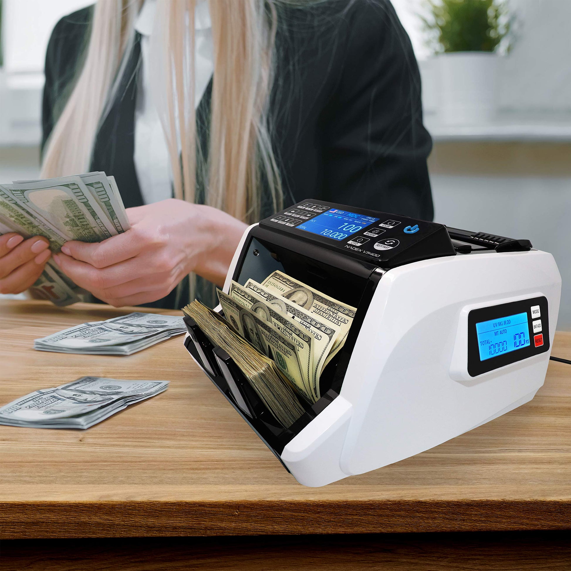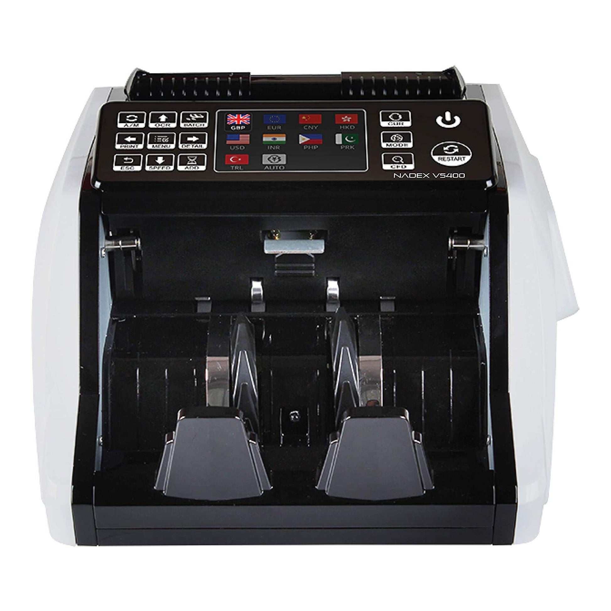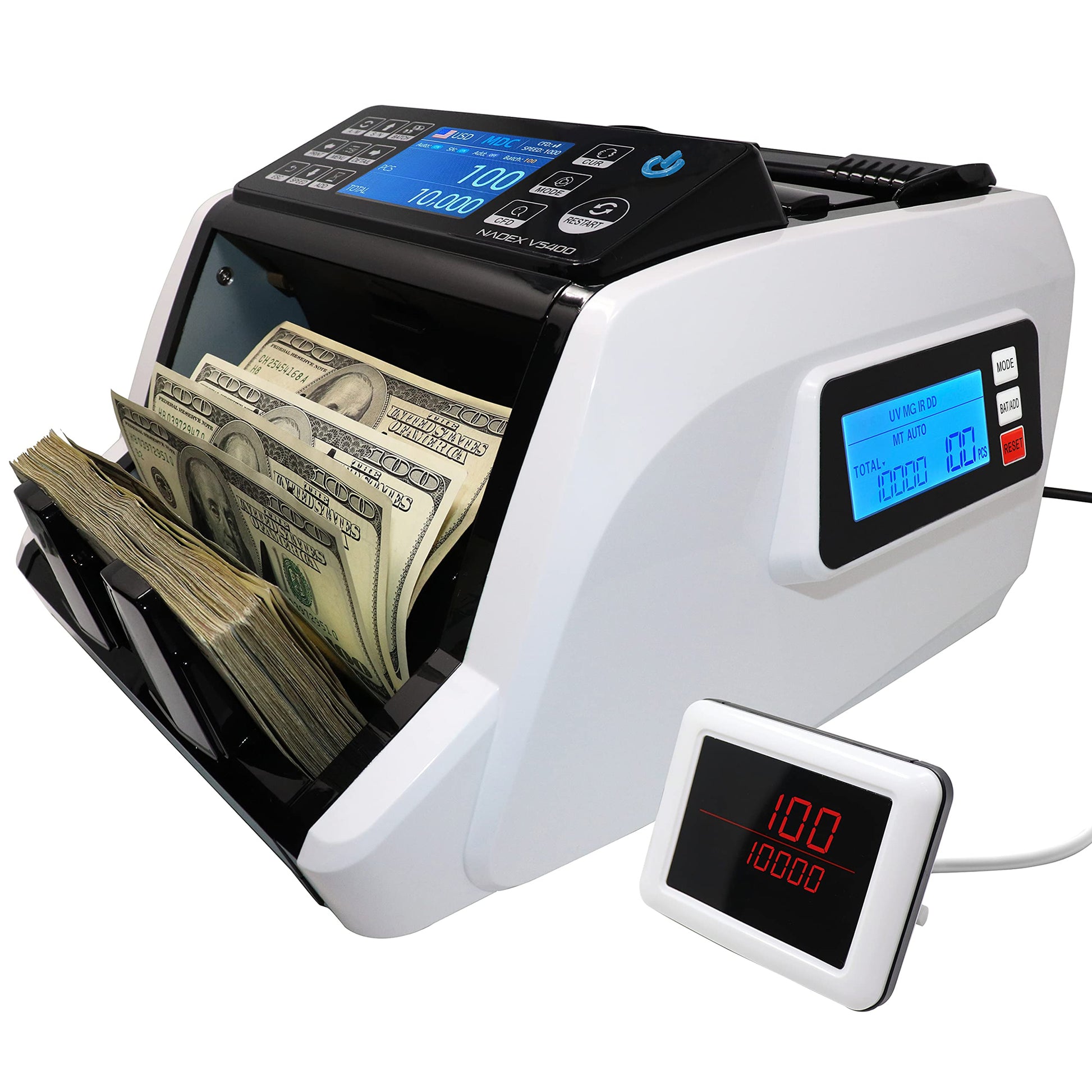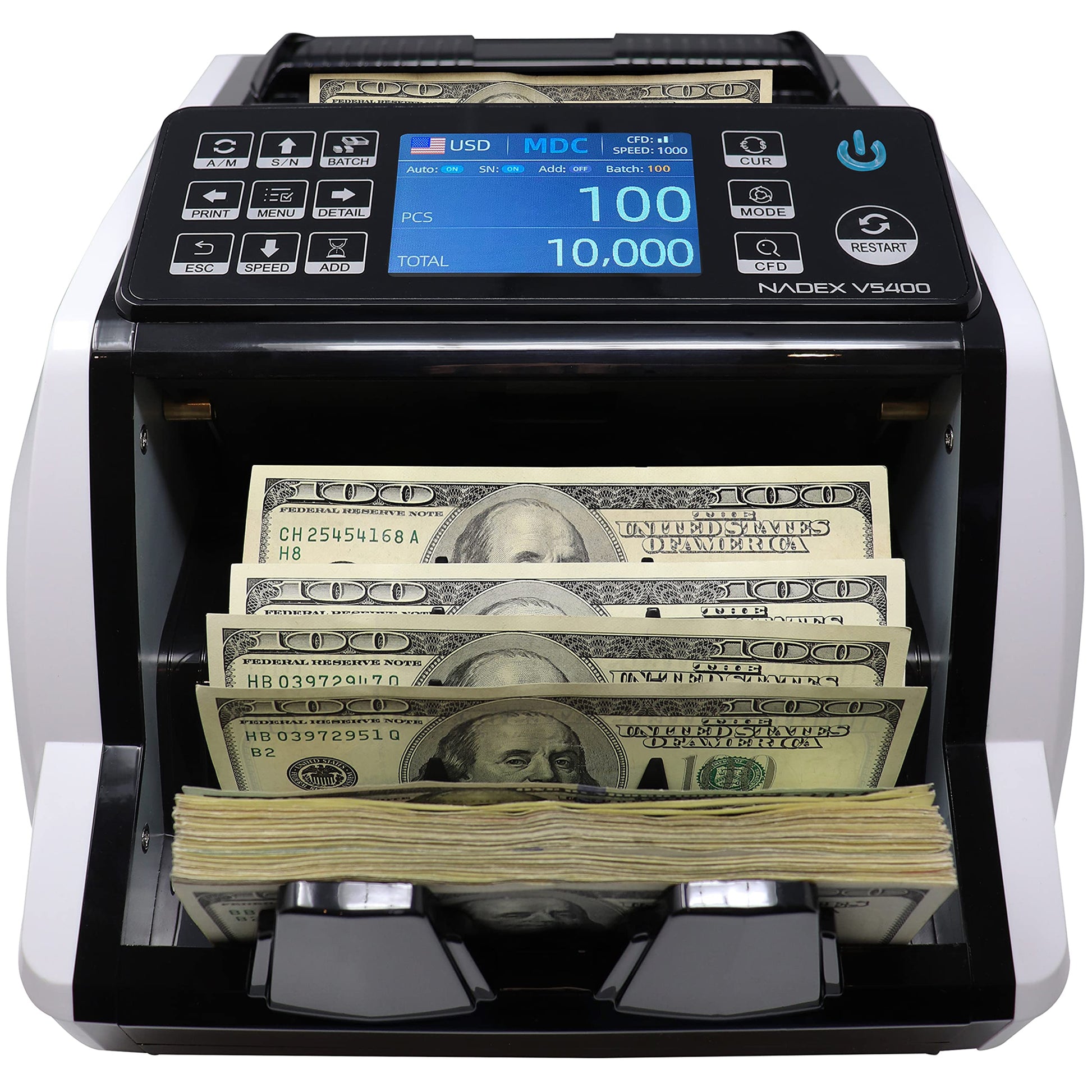 Nadex V5400 Mixed Denomination Money Counter and Counterfeit Detector- 4 Levels of Detection - UV/MG/IR/IMAGE | 60 Currency, Serial No. Detection | Counts 1000 Bills/m. Nadex V5400 Mixed Denomination Bill Counter is our high end portable bill counter and counterfeit detector for your business needs. The V4500 Counts 1000 bills per minute with a 200-300 bill hopper capacity and a 200 bill hopper capacity. The machine also accepts SD cards and USB for printing. Reduces time and eliminates human error involved when counting manually to improve efficiency, productivity and accuracy.