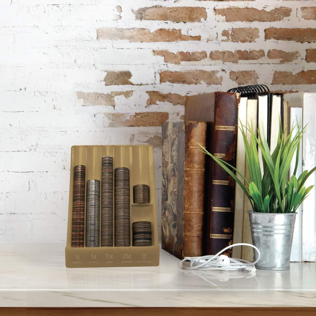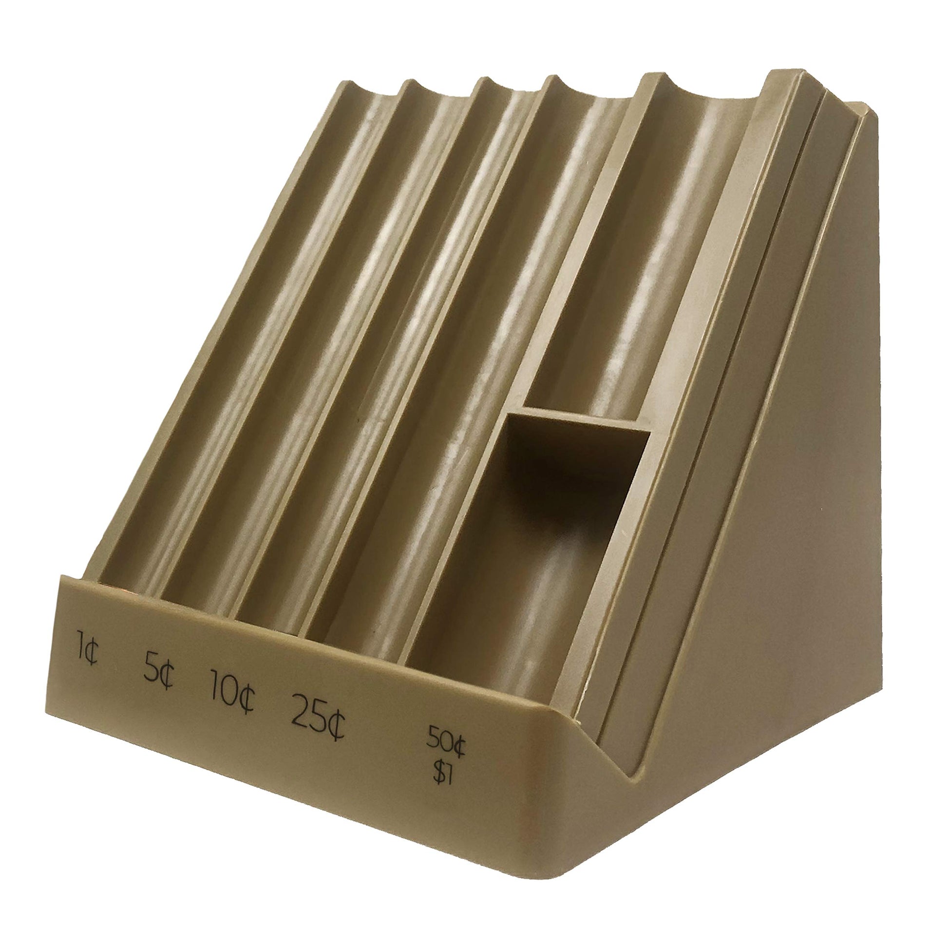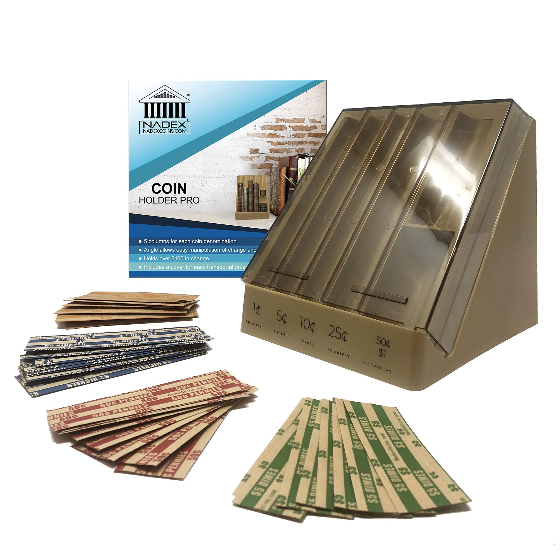 5 columns separate each coin denomination - Holds Pennies, Nickels, Dimes, Quarters, Dollars and Half Dollars. Perfect for bank tellers to organize and sort coins; great place to keep coins in a home or office. Angled slope allows easy manipulation of coins and prevents spills. Cross reference: 221477703. Includes an acrylic cover for easy transportation and storage and to prevent spilling coins.. Holds over $100 in change. 32 free coin wrappers included. Measures 6.25" L x 5.6" W x 6.5" H