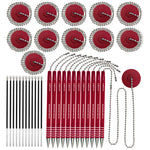 Nadex Ball Chain Security Pen Set. Pack includes 12 Red Security Pens with ball chain, 12 adhesive mounts, and 12 refills.. Rubberized grip and ridges for proper feel and writing comfort. Rubber base with peel-able sticky bottom for securing to many types of surfaces.. Security chain for attaching to base. Each pen has a small attached chain with link for quickly attaching and detaching for added convenience. Our pen also works works with many other security pen chains.. Please Note: Do not detatch the bottom plastic part of the pen as it will not be possible to re-attatch. Refills are installed by unscrewing the metal cap at the tip.. Our Guarantee: Nadex manufactures a variety of quality coin management and money storage products. Customer satisfaction is our priority so don’t hesitate to contact us with any questions or concerns. All Nadex products are also backed by a 1 Year warranty and hassle free returns.