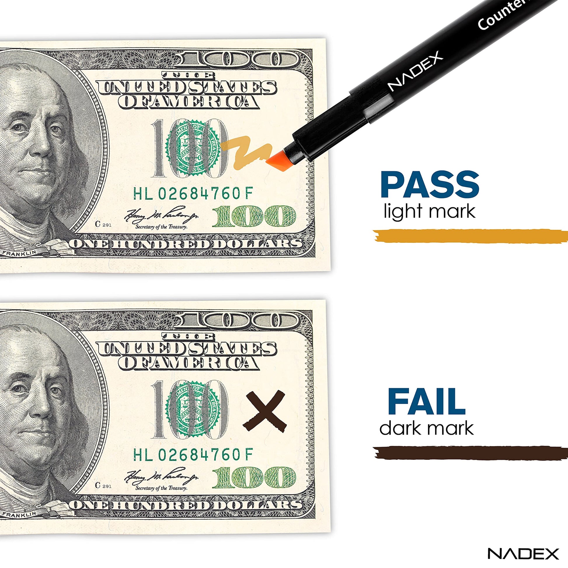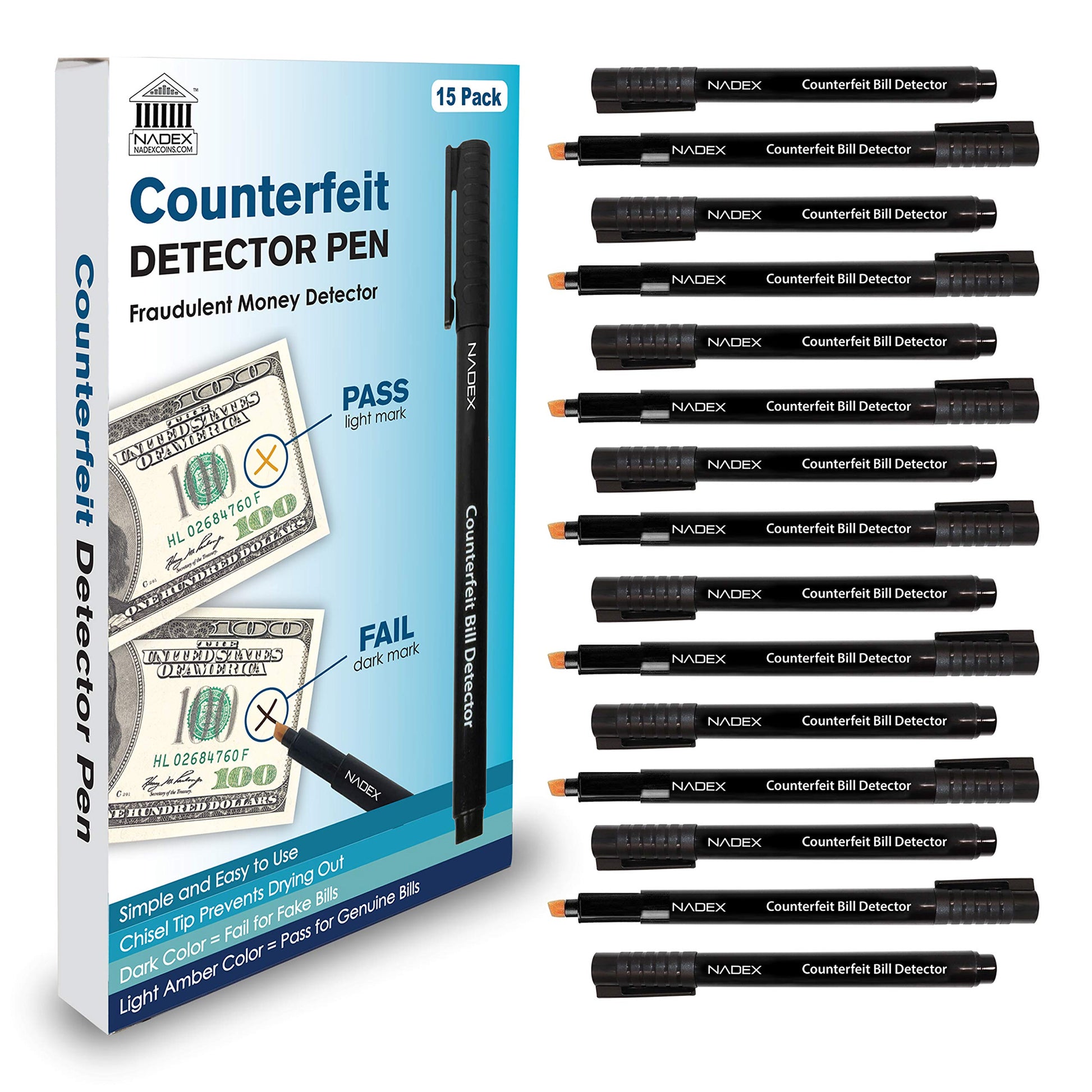 Nadex Counterfeit Pen, Easy Swipe - Gold for Real, Black for Fake, Detect Counterfeit Bills (15 Pack). Easily detect fake bills with our easy to use counterfeit bill detector. One swipe is all you need to sort out the fakes.