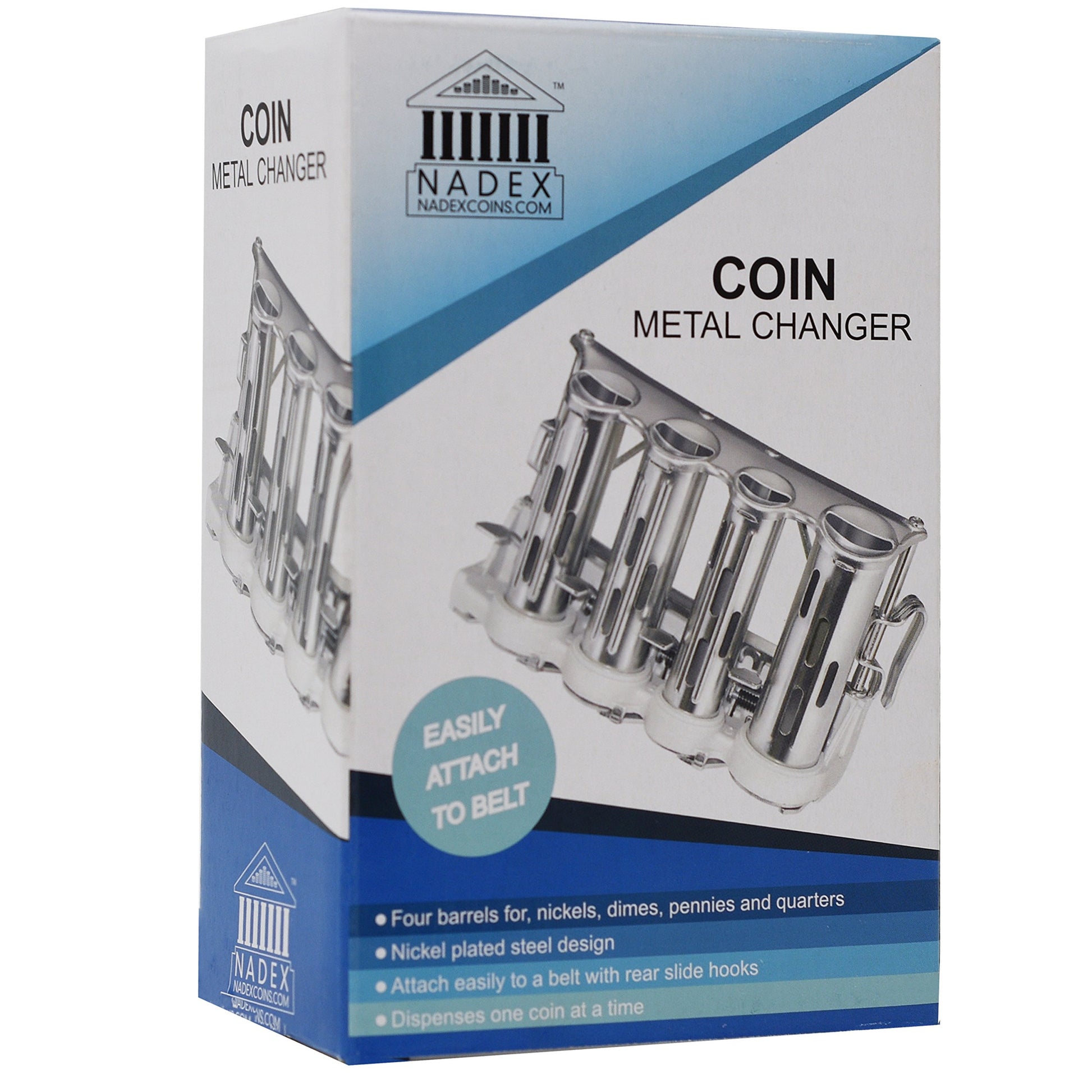 Higher Quality, Lower Price: The Nadex Coin Dispenser is made of Heavy Duty Steel which ensures this product will last for decades to come. Our research shows this product is being used by servers, fast food restaurants, carnivals, drive-ins, garage sales, flea markets and many other businesses. In addition, many people are using the money changer to organize change in their cars to use for parking meters, tolls(EZ pass), and fast food orders. Once you are organized, nothing can stop you!!!. Easily Dispense Change: Holds 38 quarters, 56 dimes, 37 nickels and 49 pennies. Simple Design: Included hooks makes it easy to attach the dispenser to anywhere you please.. Customers are using this product by attaching it to their waist area(belts, aprons) for quick dispensing. It is also compatible to be attached to thousands of accessories.. 100% Guaranteed: If you're ever unhappy with your Nadex Coin Dispenser, send it back for a full refund of your purchase price.